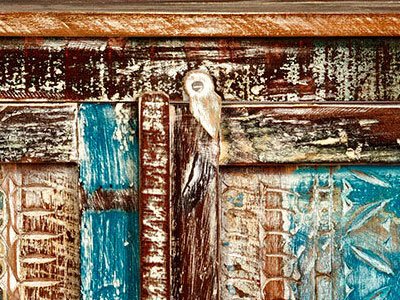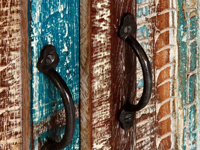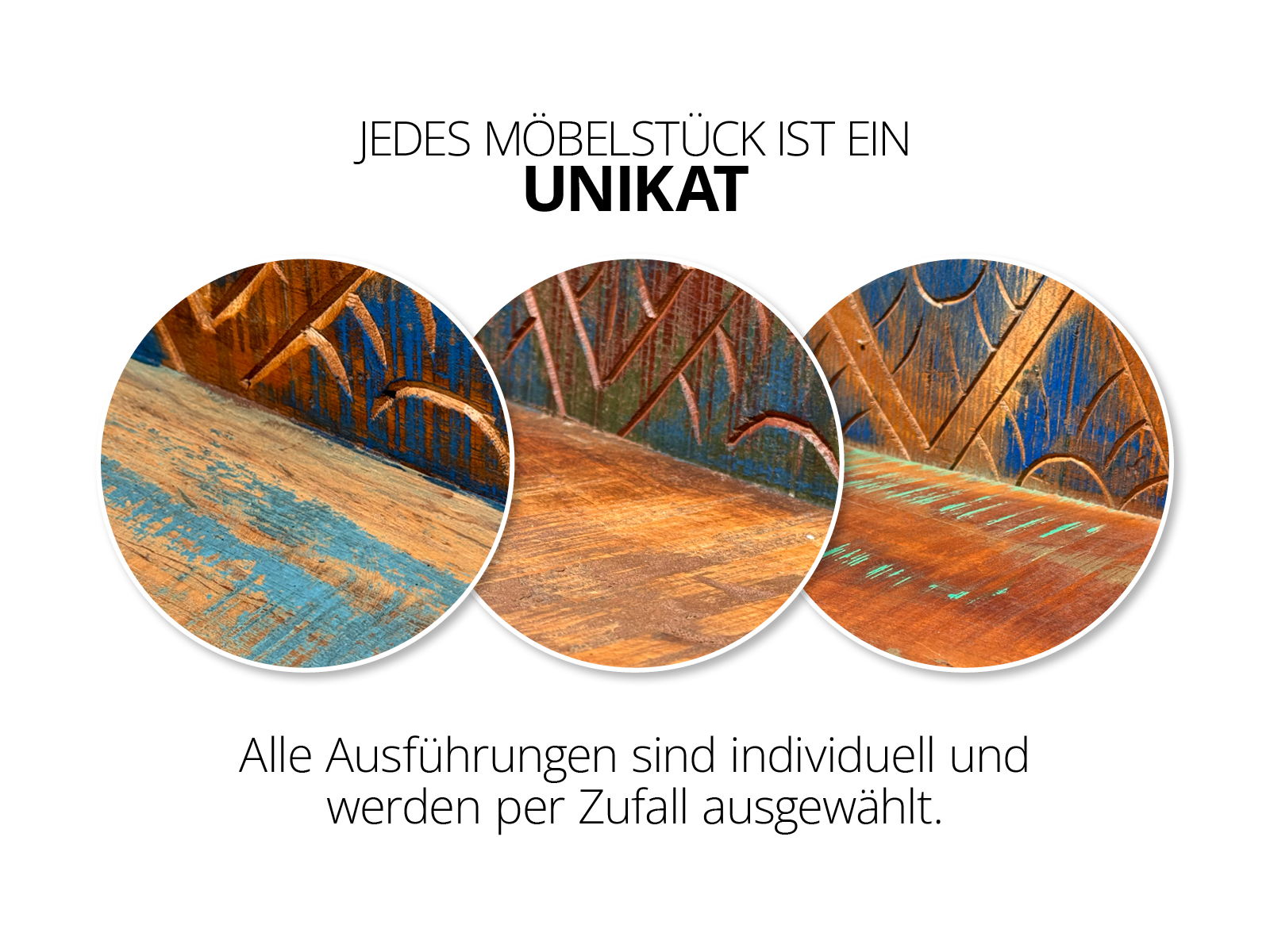 Der Hochschrank Blue Lagoon ist aus massivem Mangoholz gefertigt und zeigt eine lebendige Reliefstruktur, die jede Oberfläche zum Unikat macht; als Badmöbel passt er perfekt ins Badezimmer und wirkt wie ein buntes Designstück.