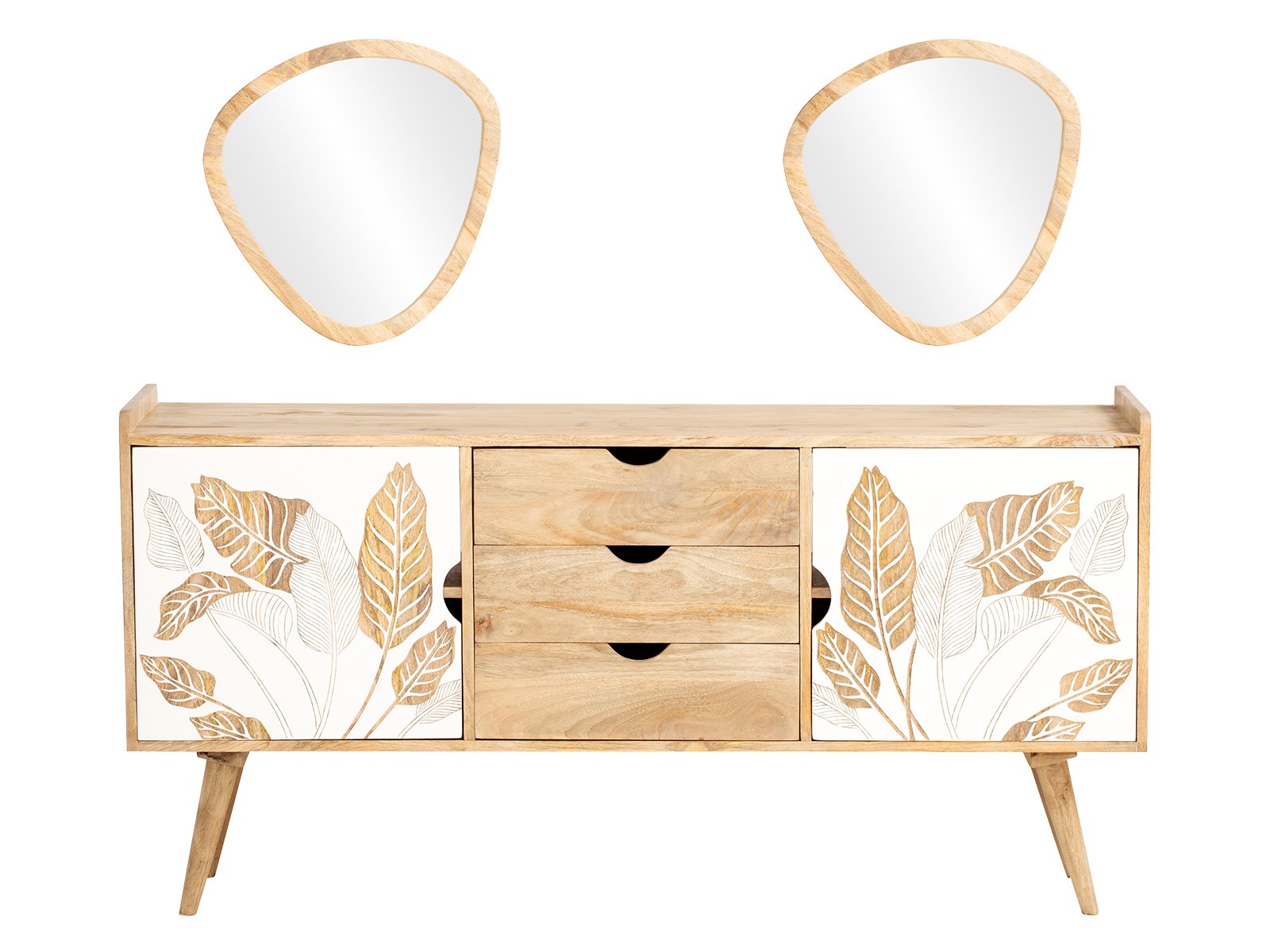 Das Barani Möbelset ist ein dekoratives Highlight für Boho- und Scandi-Bäder: die organischen Spiegel, die Blattverzierung in Weiß-Gold und die natürliche Maserung fügen sich harmonisch in moderne Badezimmer-Einrichtung ein. Ob als Waschtisch-mit-Spiegel oder als eigenständige Badkommode, dieses Möbelset bringt Wärme und Persönlichkeit in dein Bad.