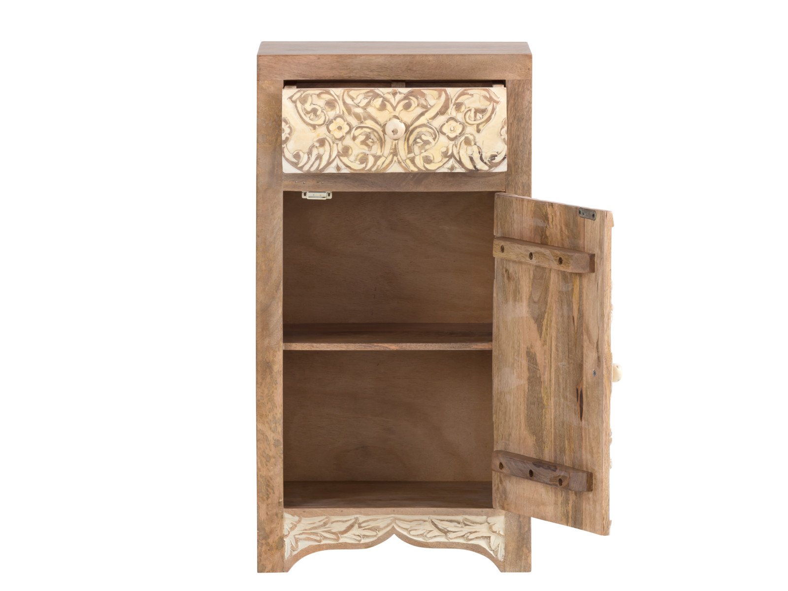 Das Badset Delhi besteht aus echtem Mangoholz, die Oberflächen sind matt lackiert und dadurch wasserabweisend sowie fleckenunempfindlich. Du fühlst beim Anfassen die warme Struktur des Mangoholzes, und die handgeschnitzten Fronten geben dem Badmöbel-Set Delhi einen leicht exotischen, rustikalen Touch.