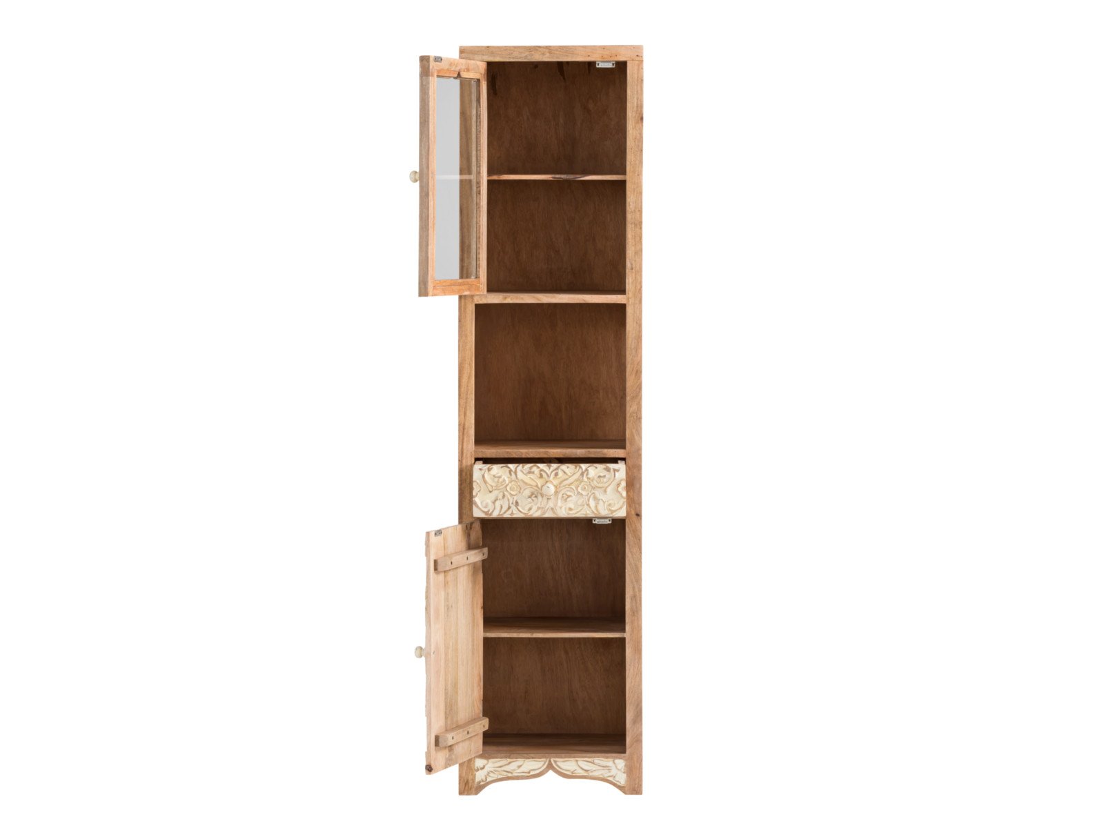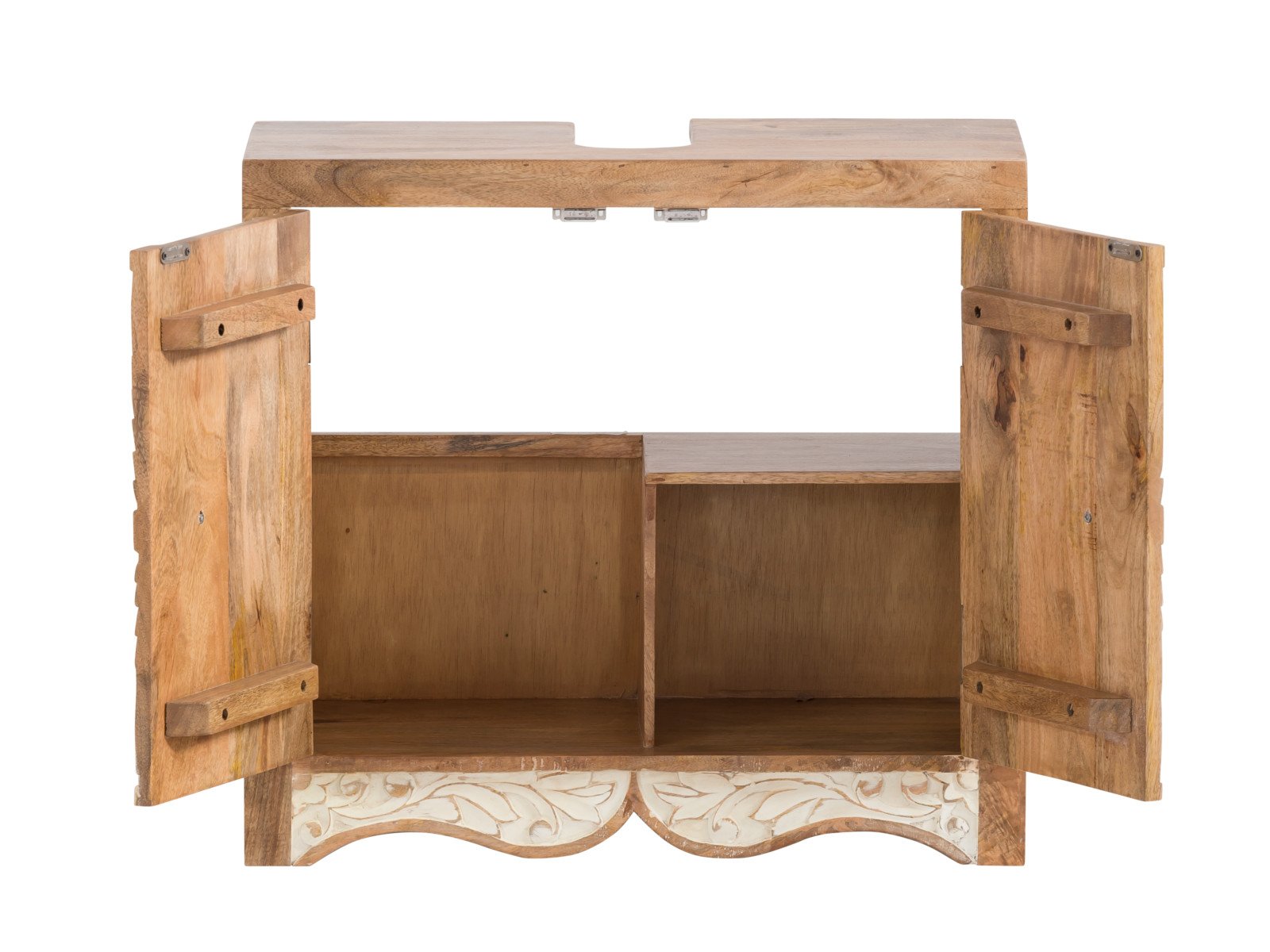Das Badmöbel-Set Delhi wirkt rustikal, aber hell und freundlich und passt sowohl ins klassische Landhaus-Badezimmer als auch in moderne Räume. Die handgeschnitzten Fronten sorgen für Gemütlichkeit und geben deinem Bad sofort eine warme, natürliche Atmosphäre.