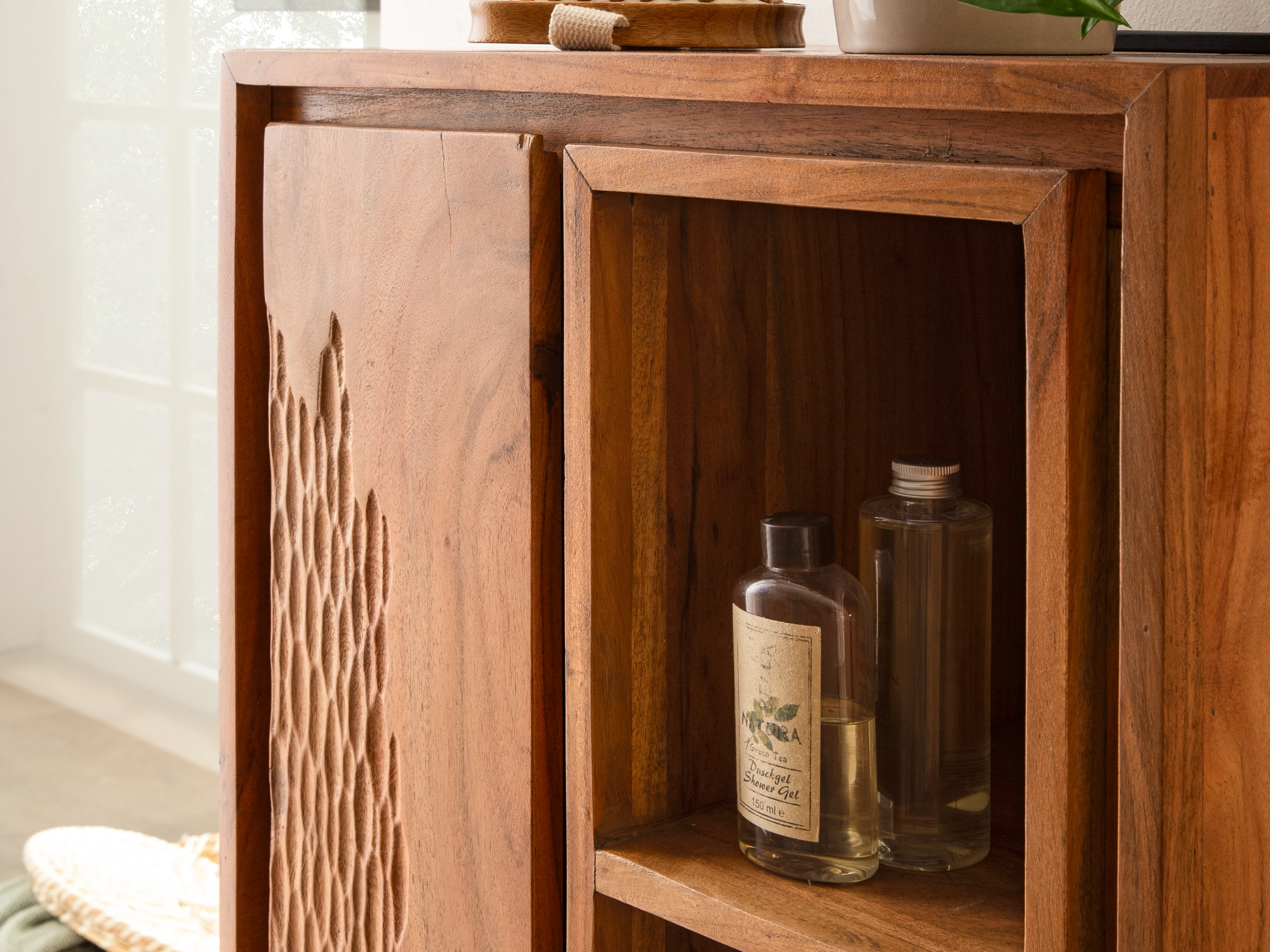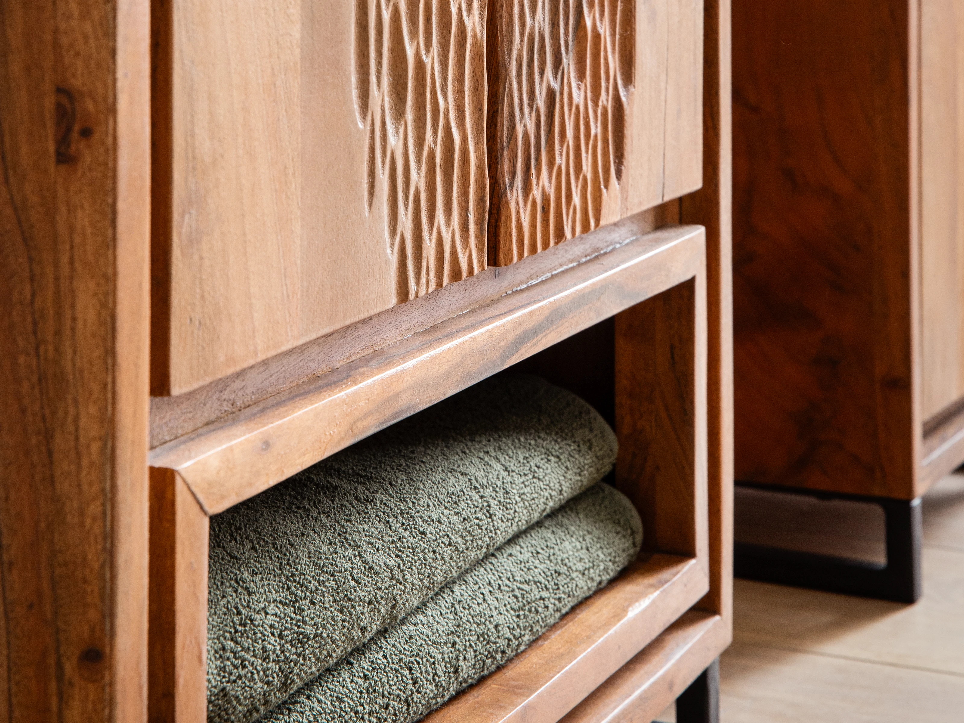 Die lackierte Oberfläche schützt das Holz vor Feuchtigkeit und macht die Möbel pflegeleicht. Jedes Stück ist dank handgearbeiteter Frontstruktur ein echtes Unikat und wird durch die schwarzen Metallfüße modern akzentuiert.