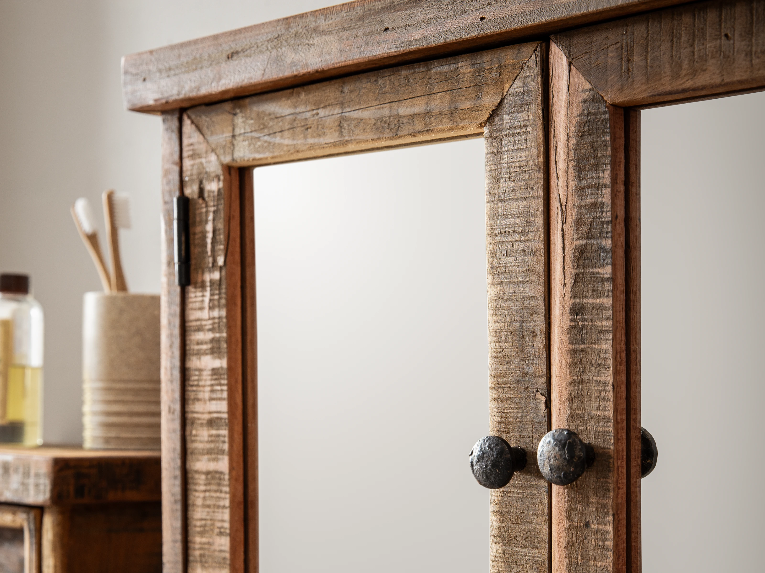 Hol dir den coolen Landhaus-Charme ins Badezimmer – mit dem 4-teiligen Badmöbelset Sumatra! Aus recyceltem Altholz gefertigt, ist jedes Stück ein echtes Unikat. Das Set besteht aus einem Waschbeckenunterschrank, einem Spiegelschrank, einer Badkommode und einem Wandschrank. Super praktisch und dabei richtig stylisch für deine Badezimmer-Einrichtung! Die Schubkästen und Türen bieten jede Menge Platz für all deine Badutensilien. Holzrisse, Scharten und kleine Kerben? Kein Mangel, sondern gewollt – das macht den rustikalen Look aus. Die unbehandelte Oberfläche lässt das natürliche Altholz so richtig wirken. Perfekt kombinierbar mit anderen Möbeln der Sumatra-Serie. So wird dein Bad ein Ort, an dem du dich richtig wohlfühlst!