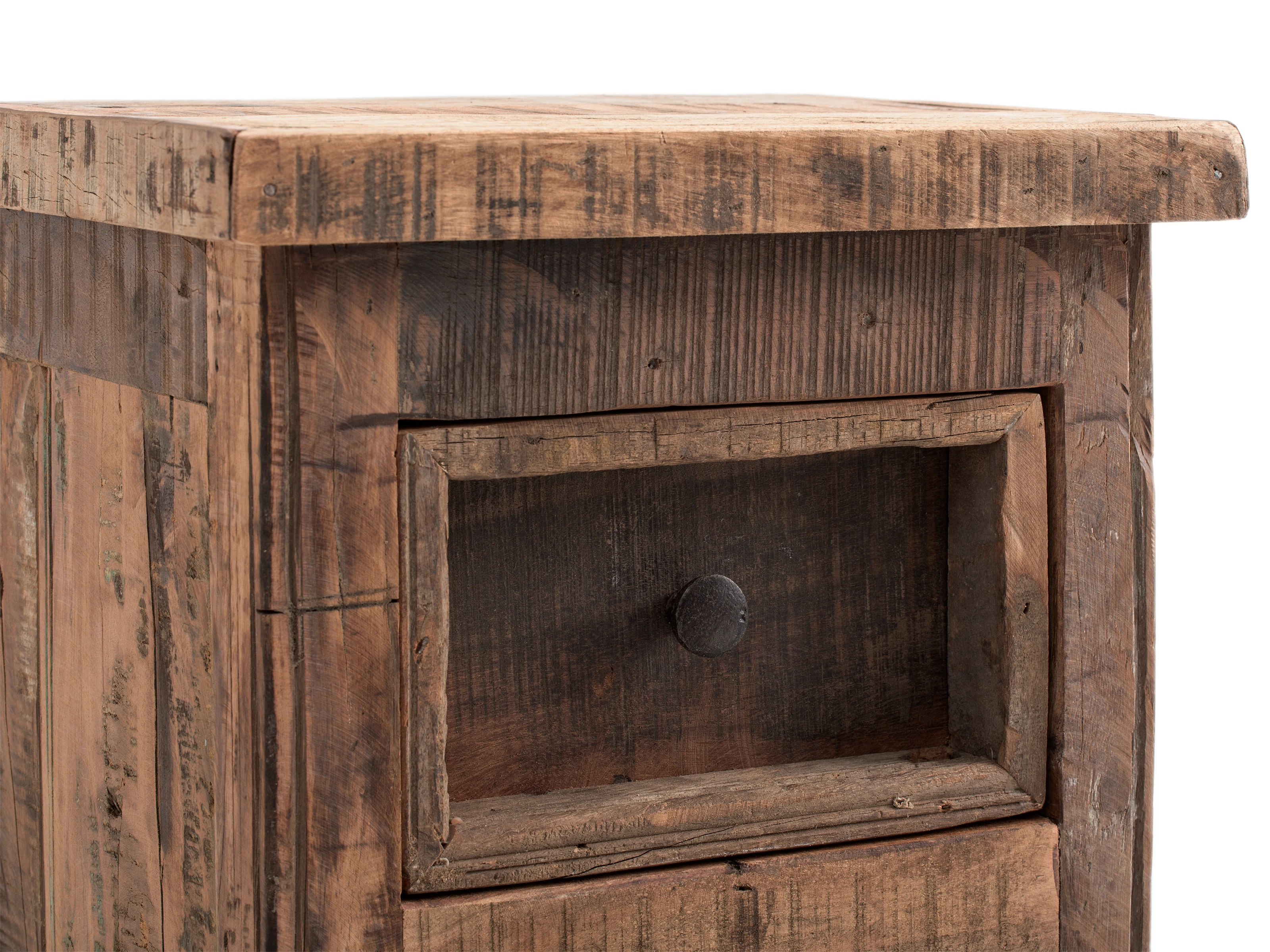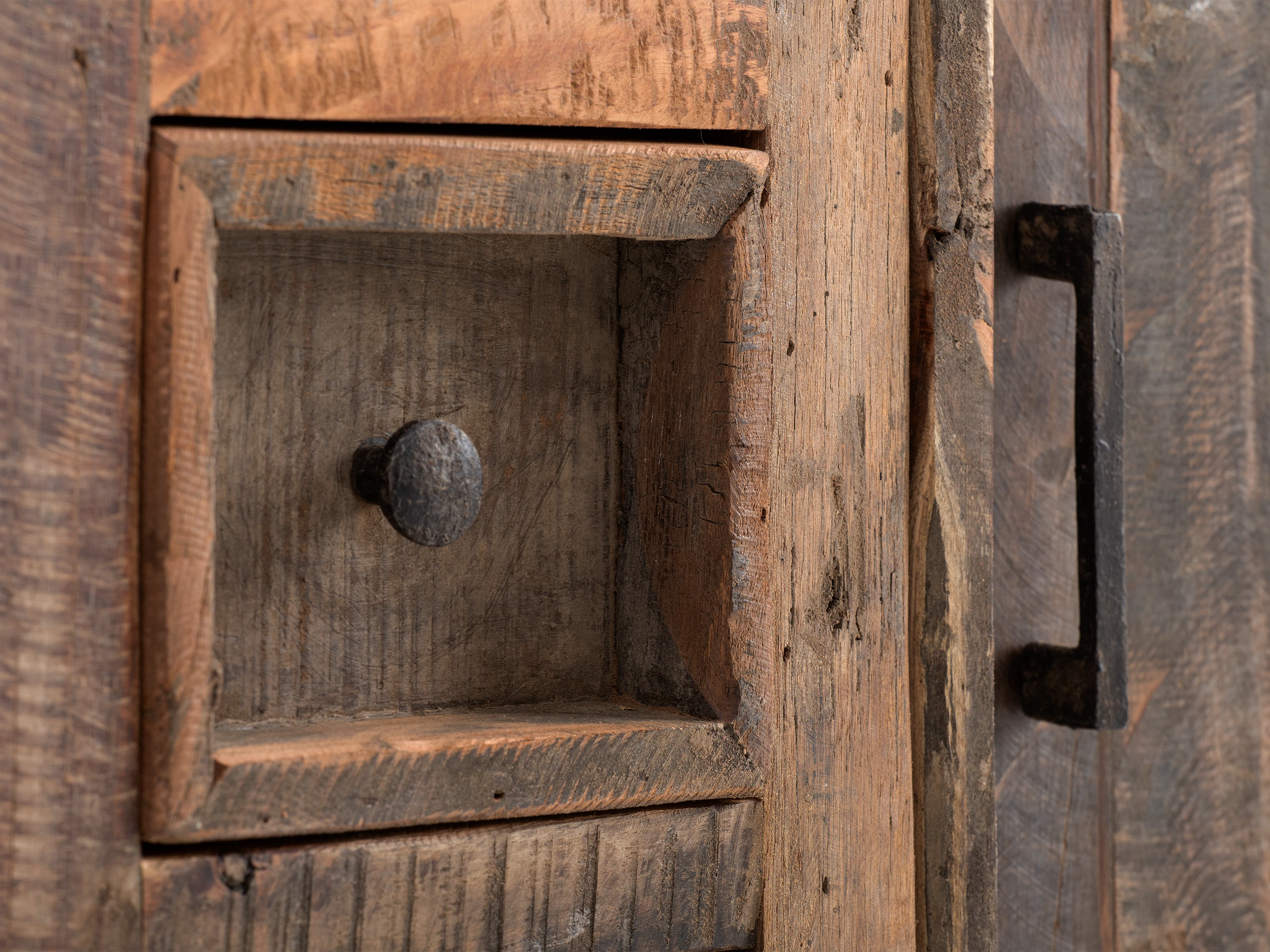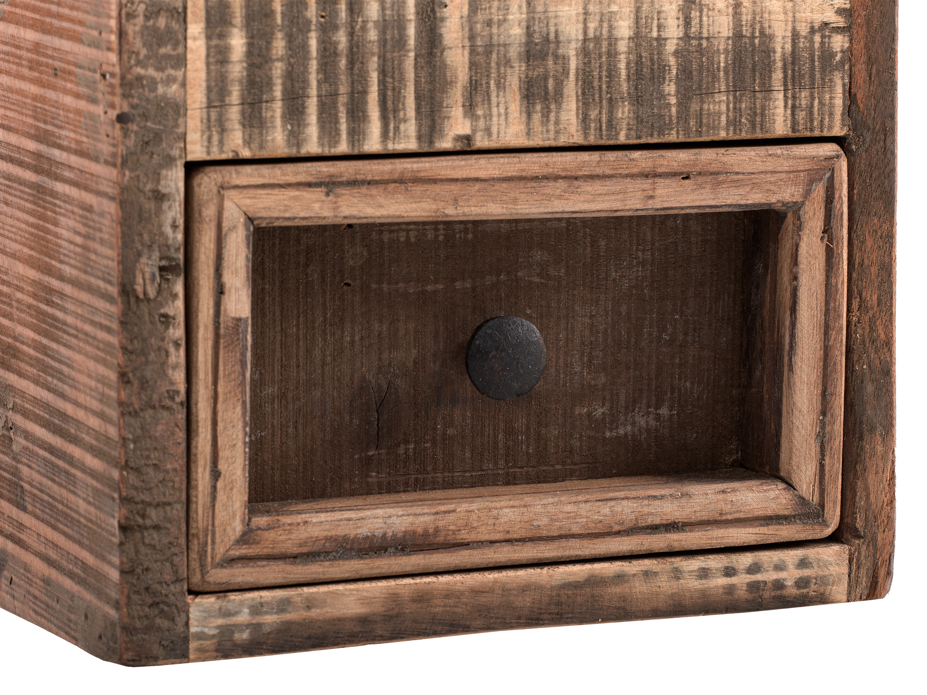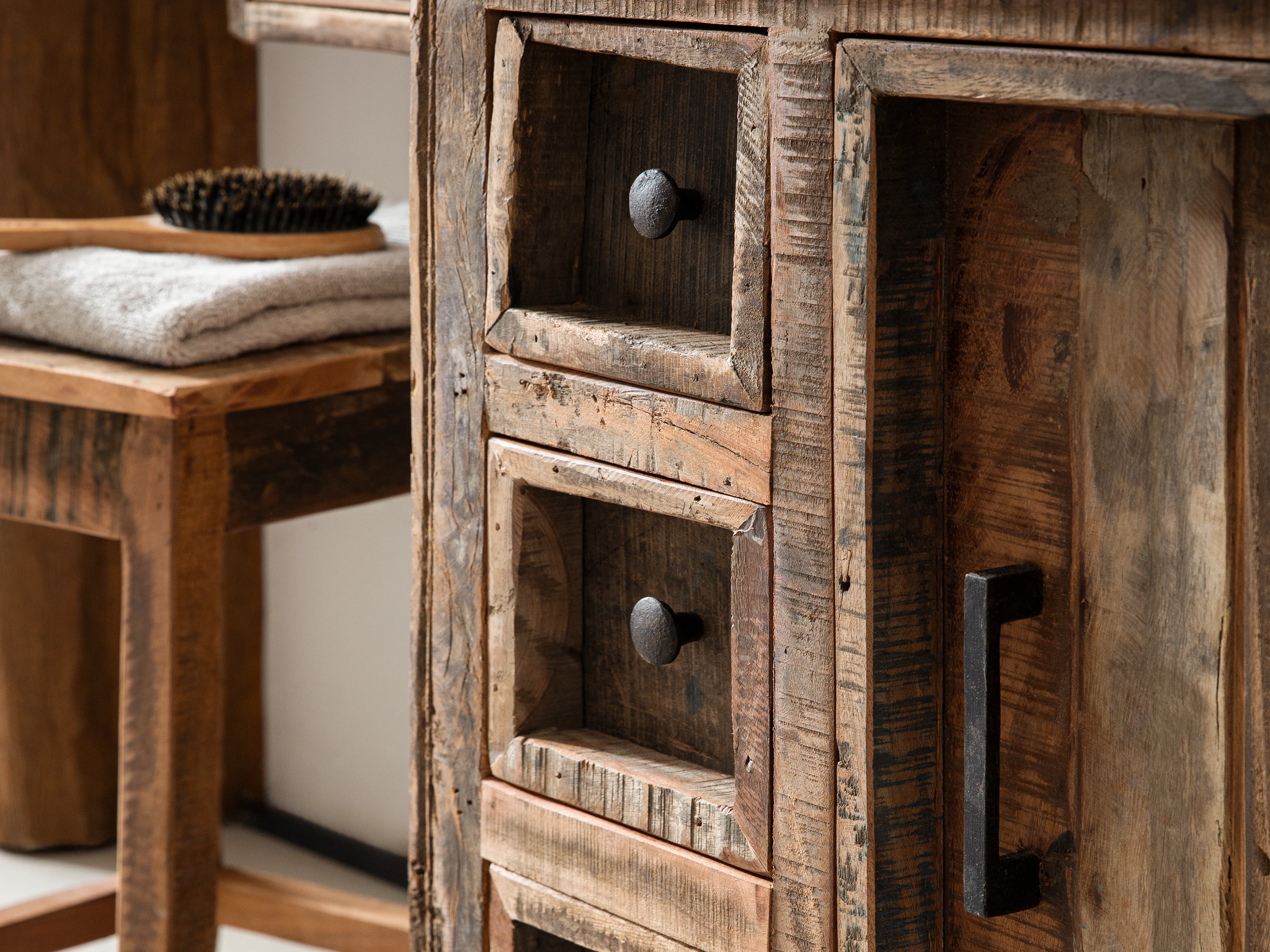 Die Schubkästen und Türen im Badset Sumatra bieten viel Platz für Handtücher, Kosmetik und Putzmittel, du kannst alles ordentlich verstauen und deine Oberfläche bleibt frei, perfekt für ein aufgeräumtes Badezimmer mit rustikalem Altholz-Charme.