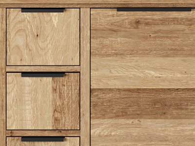 Die rustikalen Astlöcher sind ein typisches Merkmal von Wildeiche und werden bewusst mit schwarzem Holzwachs gefüllt, passend zu den schwarzen Metallgriffen und Füßen. Das unterstreicht den natürlichen Charakter und den Badezimmermöbel-Holz-rustikal Look, jedes Stück ist so ein Unikat und kein Mangel.