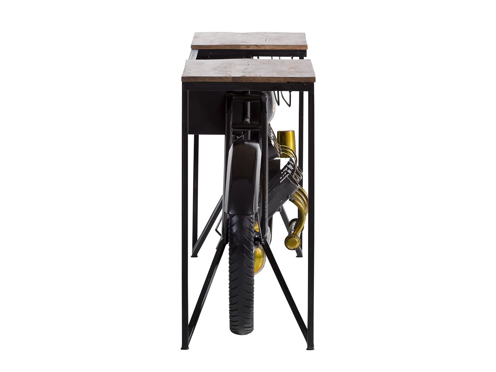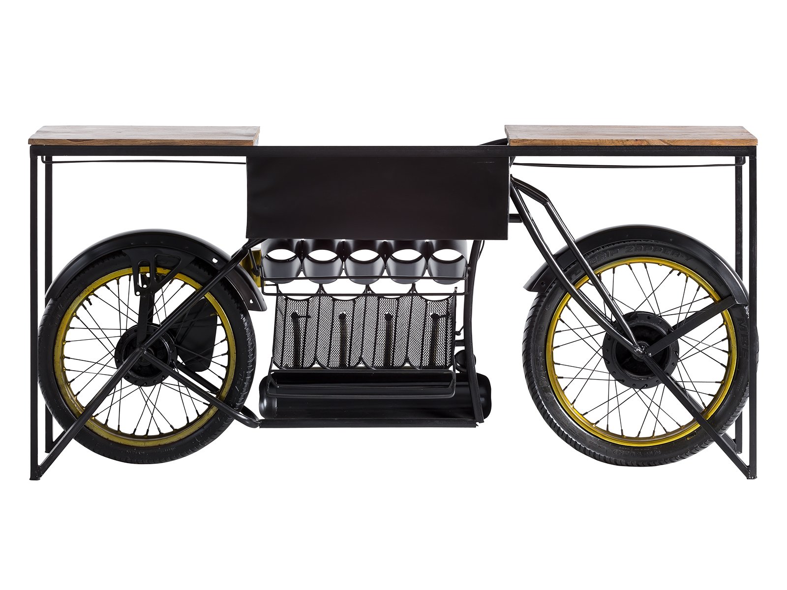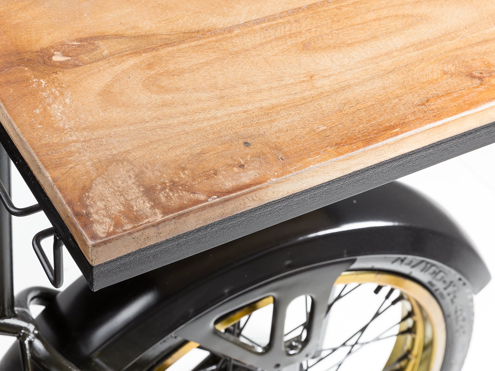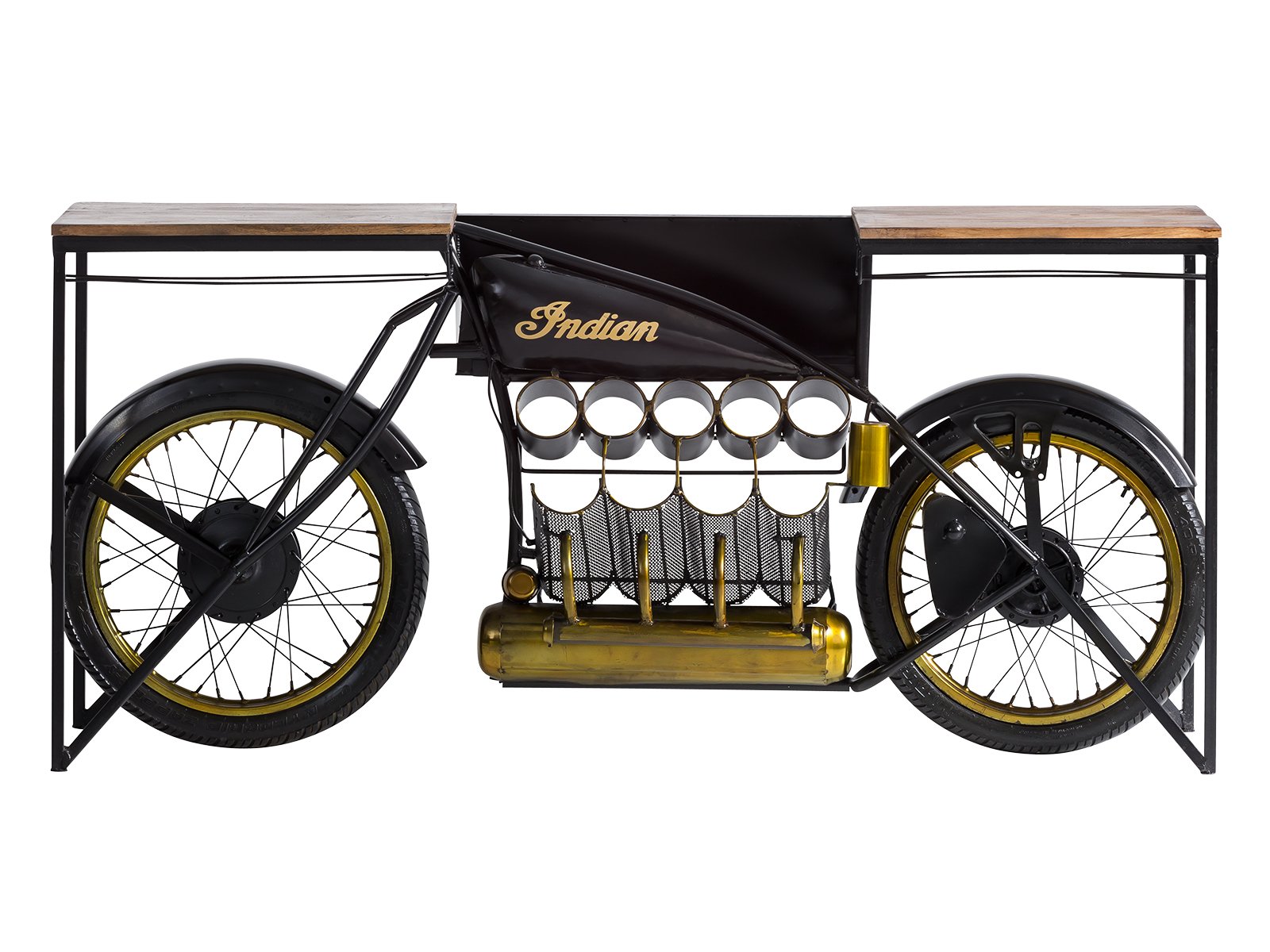 Der Bartresen Indian Black kombiniert robustes Metall mit warmem Mangoholz, das dem Tresen seinen charaktervollen Look gibt; das schwarze Gestell trifft auf goldene Akzente und macht die Motorrad Bar samt Mangoholz zu einem echten Hingucker.