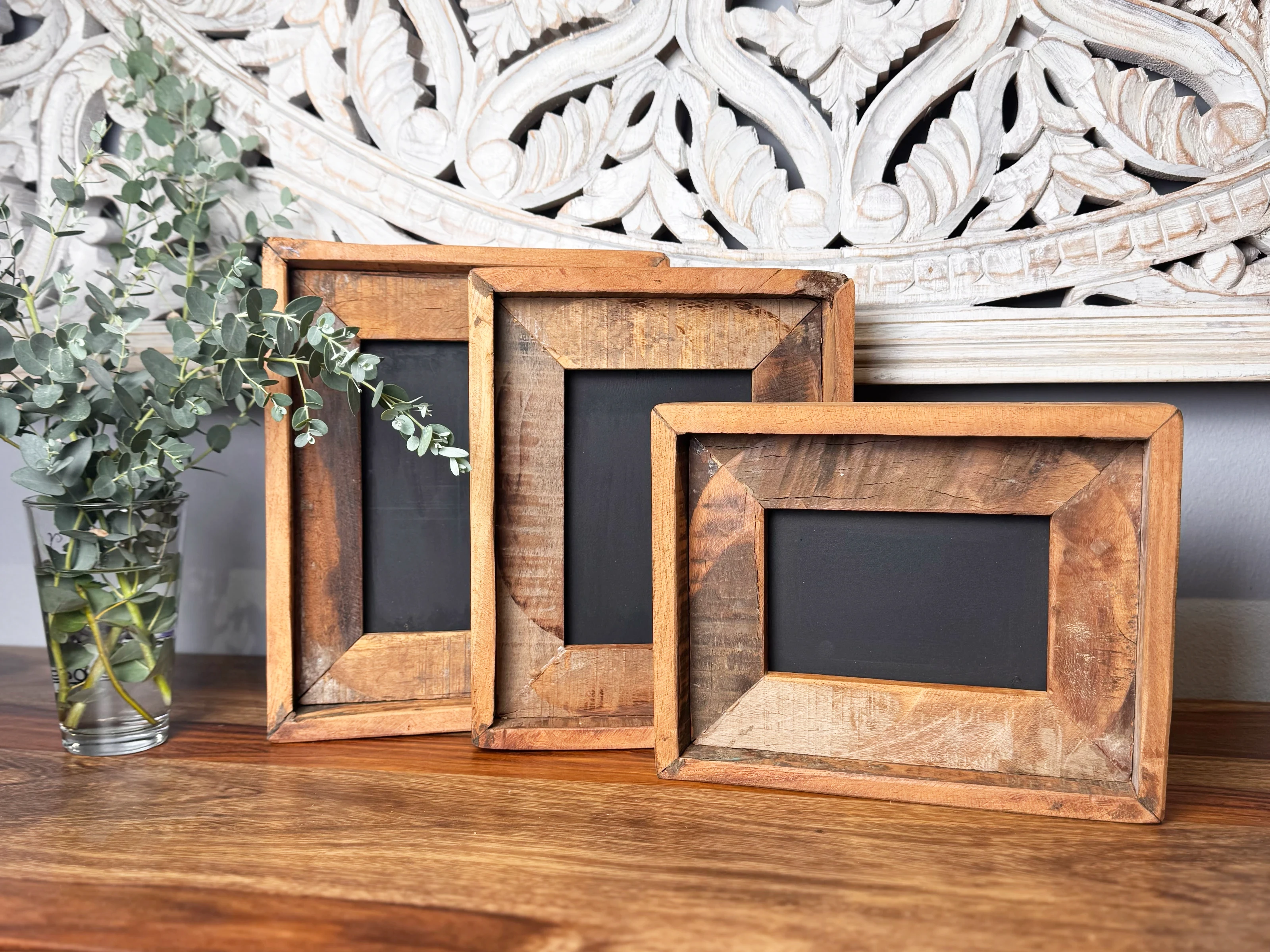 Nein, die Rahmen kommen bewusst ohne Glasscheiben, damit deine Bilder, Zeichnungen oder getrocknete Blumen direkt wirken. Die offene Optik und die schwarze Rückwand laden sogar dazu ein, mit Kreide zu zeichnen oder kleine Notizen auf dem Altholz-Charme zu ergänzen.
