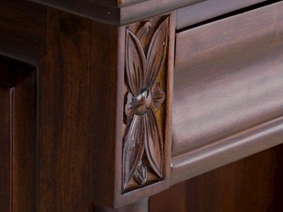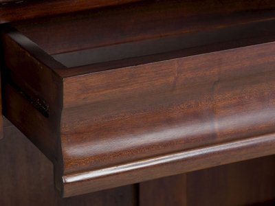 Gefertigt aus hochwertigem, teilmassivem Mahagoni-Holz, überzeugt das Regal durch seine robuste Bauweise und seine edle Ausstrahlung. Die Oberfläche schimmert in einem tiefen Dunkelbraun und verleiht dem Möbelstück einen Hauch britischer Eleganz. Die feine Maserung des Holzes macht jedes Regal zu einem Unikat.