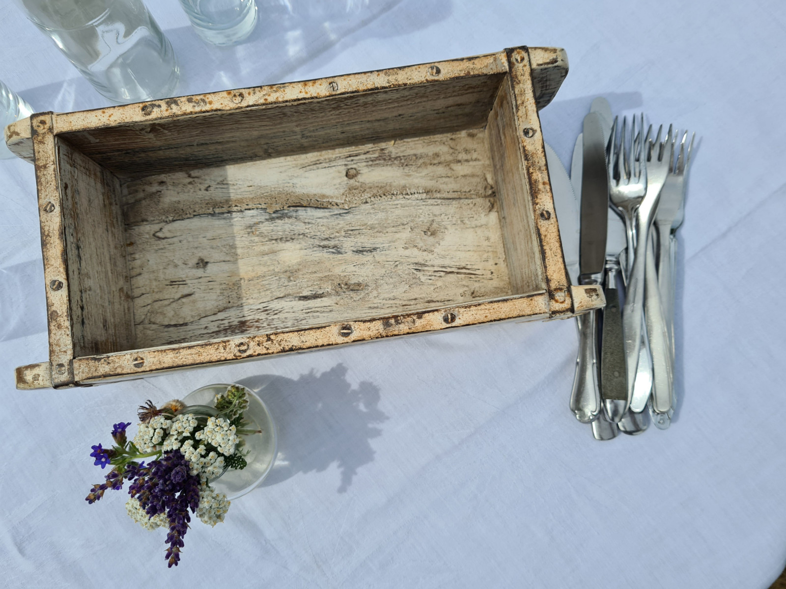 Diese antike indische Form hat zur Herstellung von Ziegeln gedient. Sie ist aus altem Holz und alten Beschlägen hergestellt. Die Oberfläche hat ein weißes Finish erhalten. Upcycling - deshalb können diese Formen nun eine tolle Tischdekoration sein für Blumen und Kerzen. Als Schale oder Taschentücherbox dienen oder in der Küche ein toller Platz für Salz & Pfeffer oder das Öl & Essig Set sein. Auch im Büro macht sie sich gut als Helfer für die Ordnung, kann aber auch perfekt auf der Terrasse für Saucen oder Besteck genutzt werden. Aufgrund der Herstellung aus altem Holz und alten Beschlägen können sich die Formen in Farbe, Beschaffenheit und Größe leicht unterscheiden.