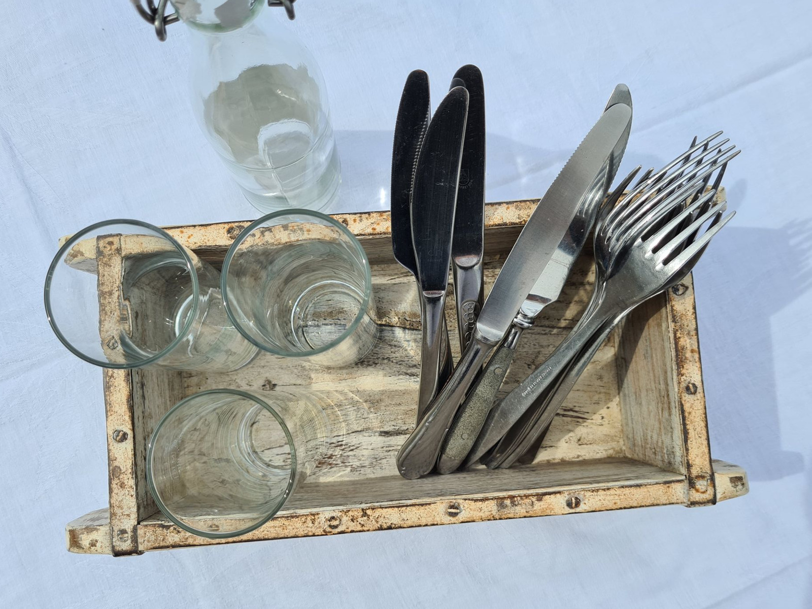 Das Außenmaß der Holzkiste beträgt 33x15x10 cm, innen ist Platz für kleinere Dinge, ungefähr 24x8x12 cm. Die Maße machen die Dekokiste handlich genug für den Tisch und groß genug für Blumen, Servietten oder Gewürze.