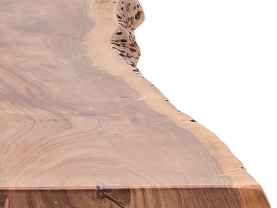 Kein Tisch ist wie der andere: Jeder Baumkantentisch ist ein Unikat, denn die Esstisch-Massivholz-Platte hat bewusst belassene Astlöcher und natürliche Unregelmäßigkeiten. Wenn du einen Holztisch suchst, der Persönlichkeit zeigt, ist dieser Esstisch-Akazie genau richtig.