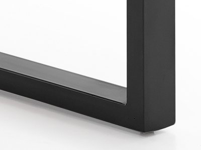 Der Tisch kombiniert Esstisch-Massivholz mit einem robusten U-Gestell aus schwarzem Metall im Industrial-Design. Die Metallbeine müssen montiert werden, unter ihnen sitzen höhenverstellbare Kunststofffüße, die Unebenheiten ausgleichen und so für sicheren Stand sorgen.