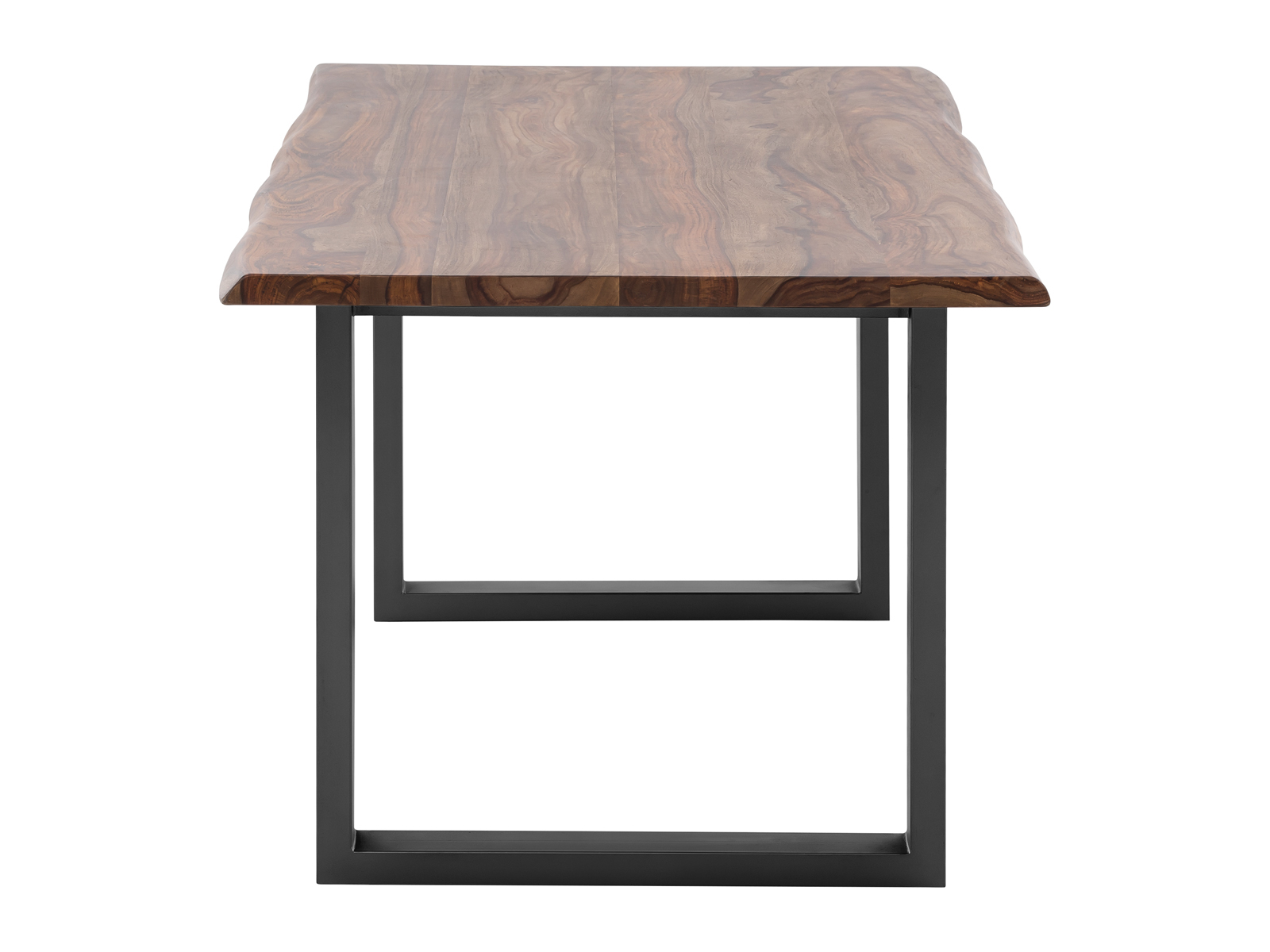 Die Tischplatte besteht aus durchgehenden Holzelementen aus robustem Massivholz-Palisander. Die warme Holzfarbe bringt sofort Gemütlichkeit in dein Esszimmer, deine Wohnküche oder dein Loft. Unterstützt wird der Look durch ein stabiles schwarzes U-Gestell aus Metall – ein spannender Kontrast, der den Tisch modern und gleichzeitig natürlich wirken lässt.