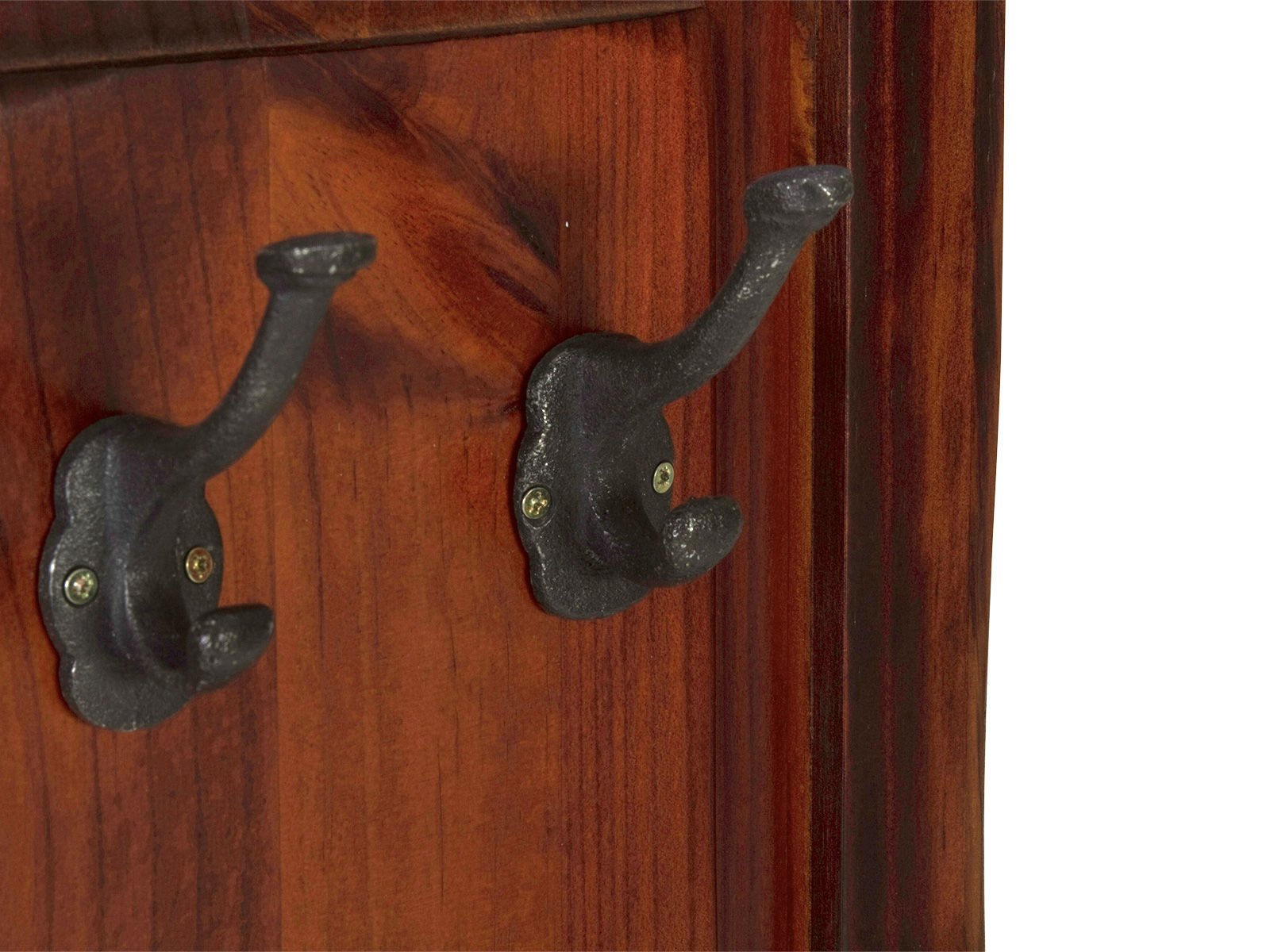 Das Garderobenset besteht aus lackiertem Pinienholz und strahlt echtes Massivholz-Flair aus. Die braune Oberfläche mit sichtbarer Maserung und die Metallapplikationen geben dem Set seinen Landhausstil und machen es zu dekorativen, rustikale-Eingangsmöbel, die Wärme und Charakter in deinen Flur bringen.