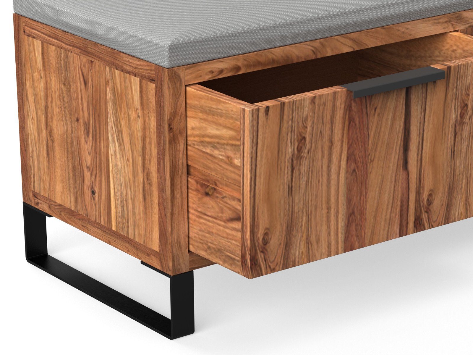 Ja, das ist Massivholz-Flurmöbel aus Akazienholz mit natürlicher, heller Holzmaserung. Die Kombination aus massivem Holz und schwarzen Metallfüßen sorgt für Robustheit und langen Gebrauch, typisch für hochwertige Dielenmöbel-Holz.