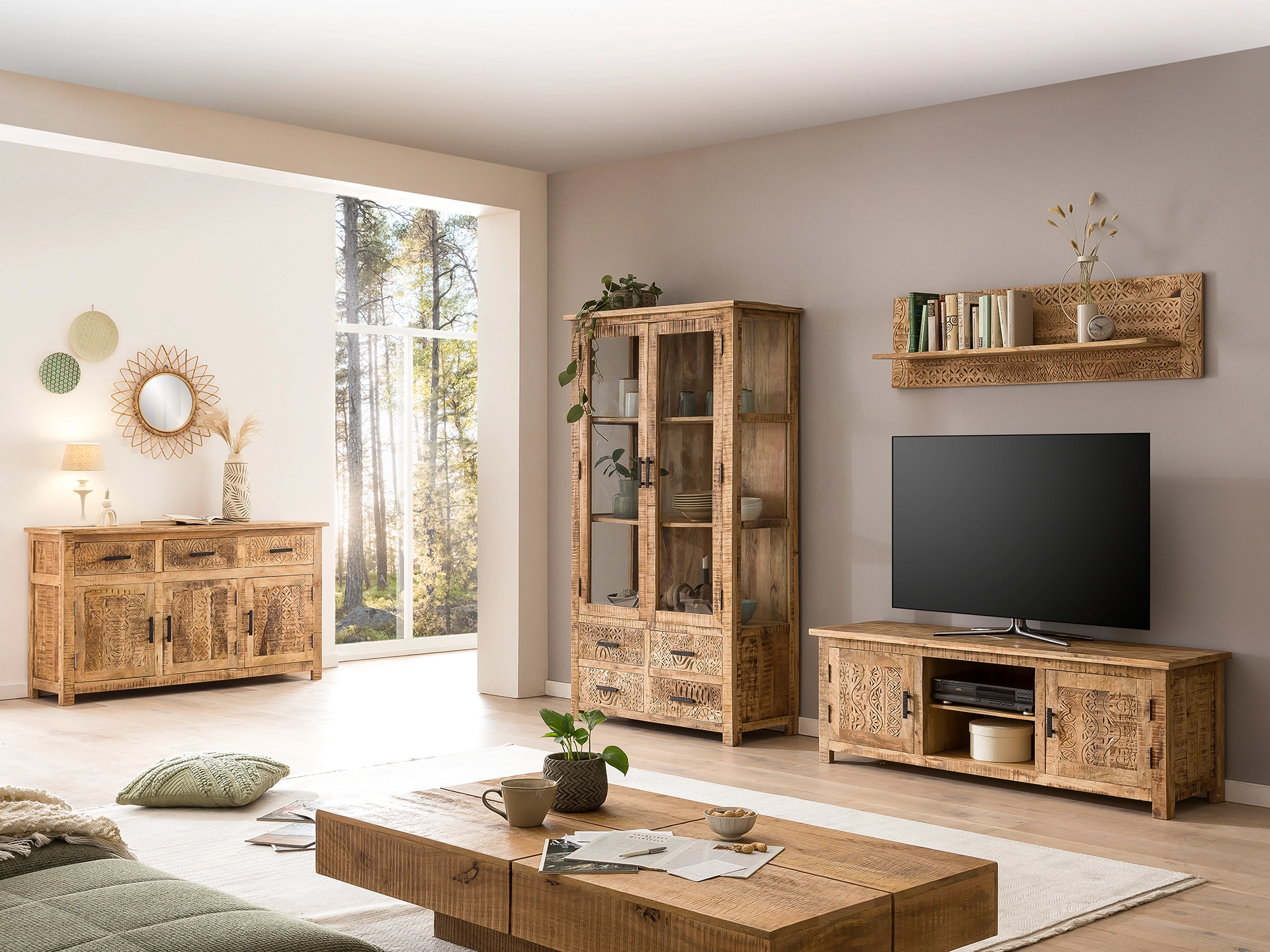 Die MUMBAI-Möbel beeindrucken auf den ersten Blick mit klaren Linien, doch ihre charmanten Schnitzereien machen sie zu den besten Alltagsbegleitern. Helles Mangoholz verleiht Vitrinen, Kommoden und Co. eine leichte Eleganz, während die natürliche Maserung den resoluten Schnitt auflockert.