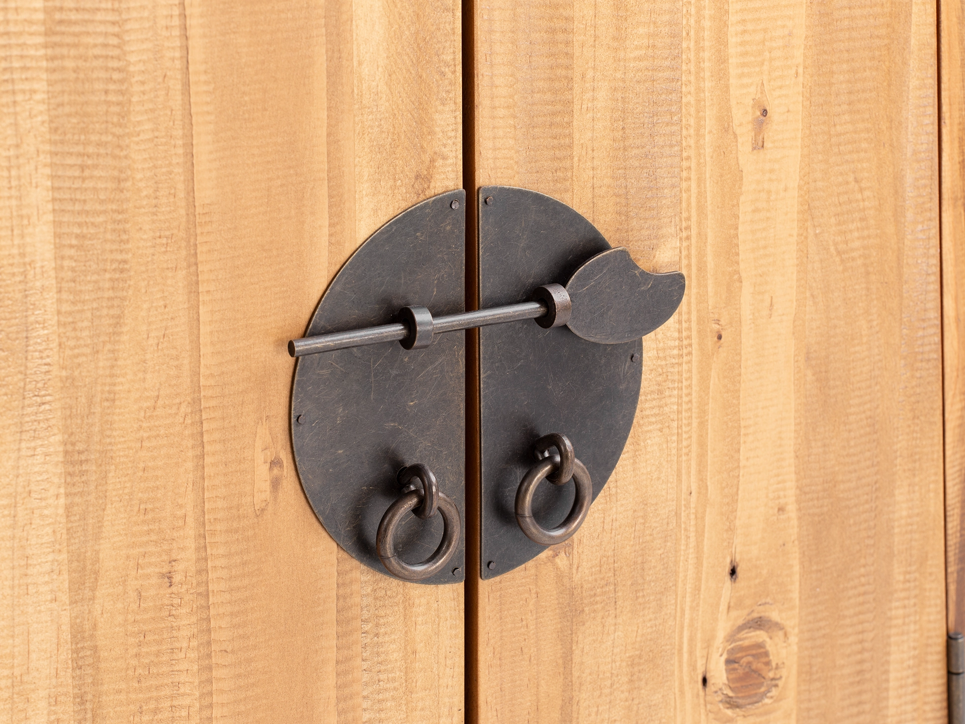 Mit ihren trapezförmigen Konturen und markanten Deckseiten sorgen die Schränke für ein einzigartiges Design. Die außergewöhnlichen Ringgriffe und Metallverschlüsse verleihen ihnen einen besonderen Look. Gefertigt aus massiver Pinie, vereinen sie rustikale Optik mit geheimnisvollem Charme.