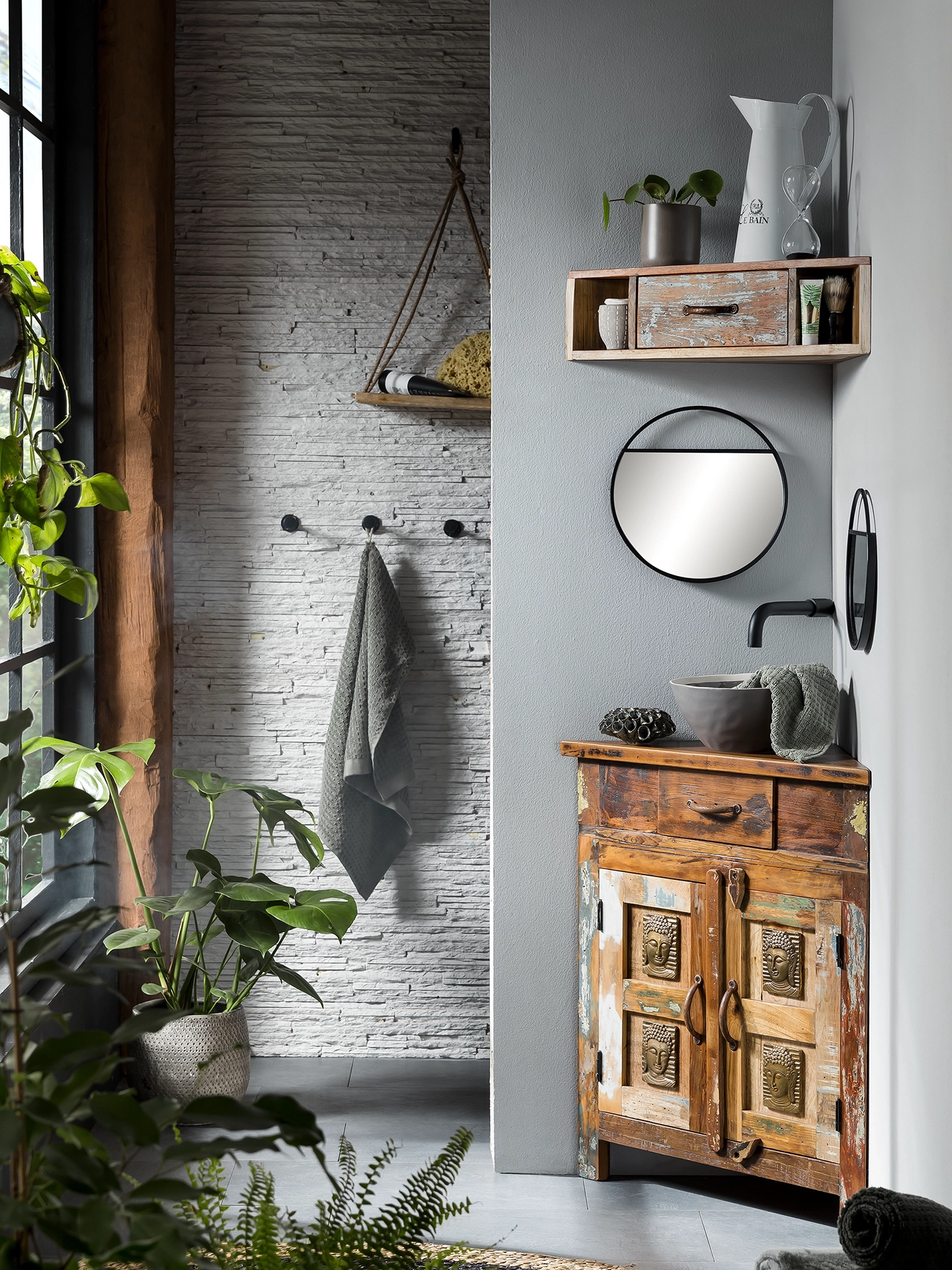 SUMANA ist eine massive, rustikale Badezimmer Serie aus recyceltem Hartholz. Sie lebt von den spirituellen Highlights in Form von Buddha Figuren und von den bunten Farbakzenten, welche das recycelte Holz mit sich bringt.