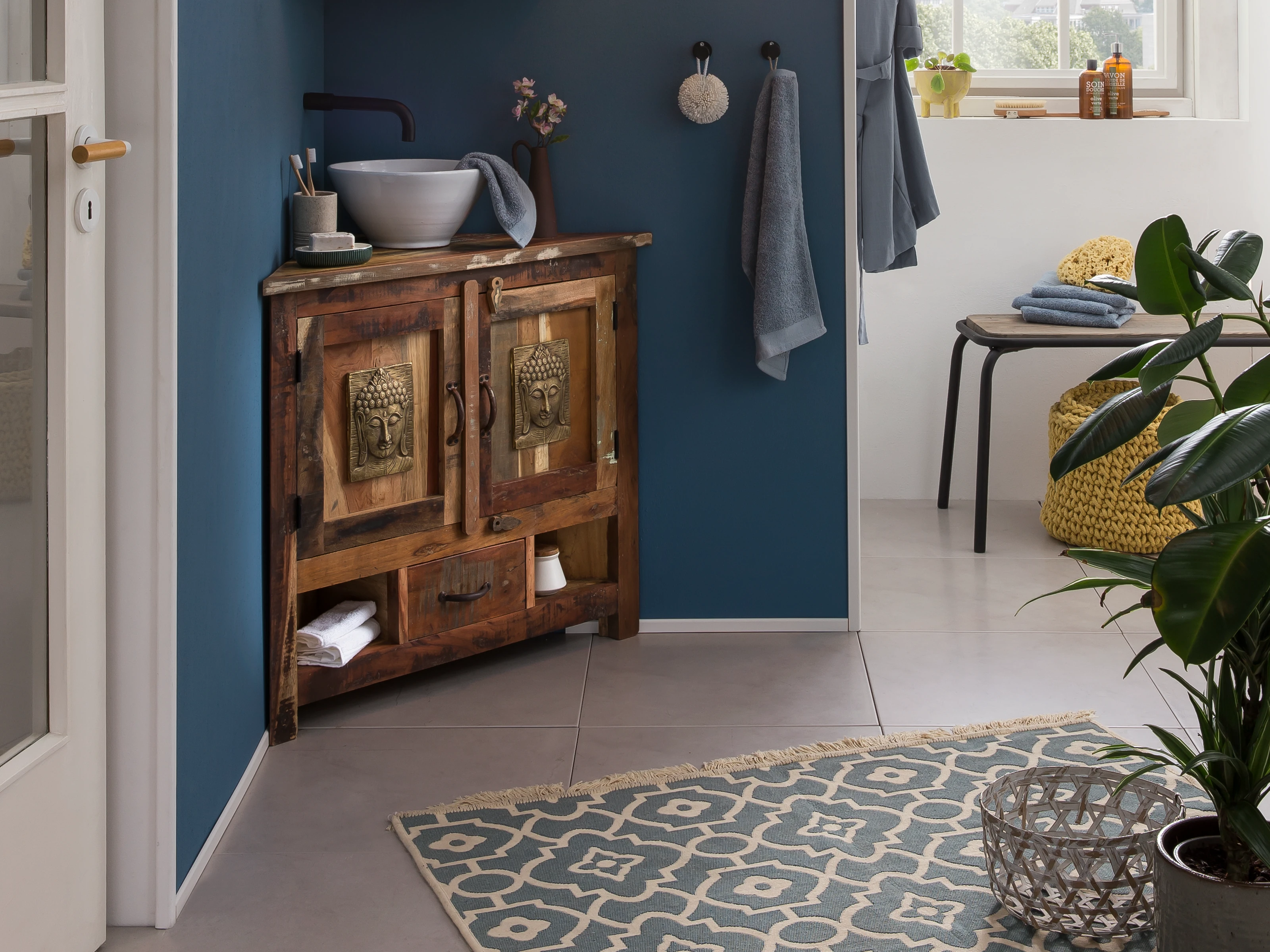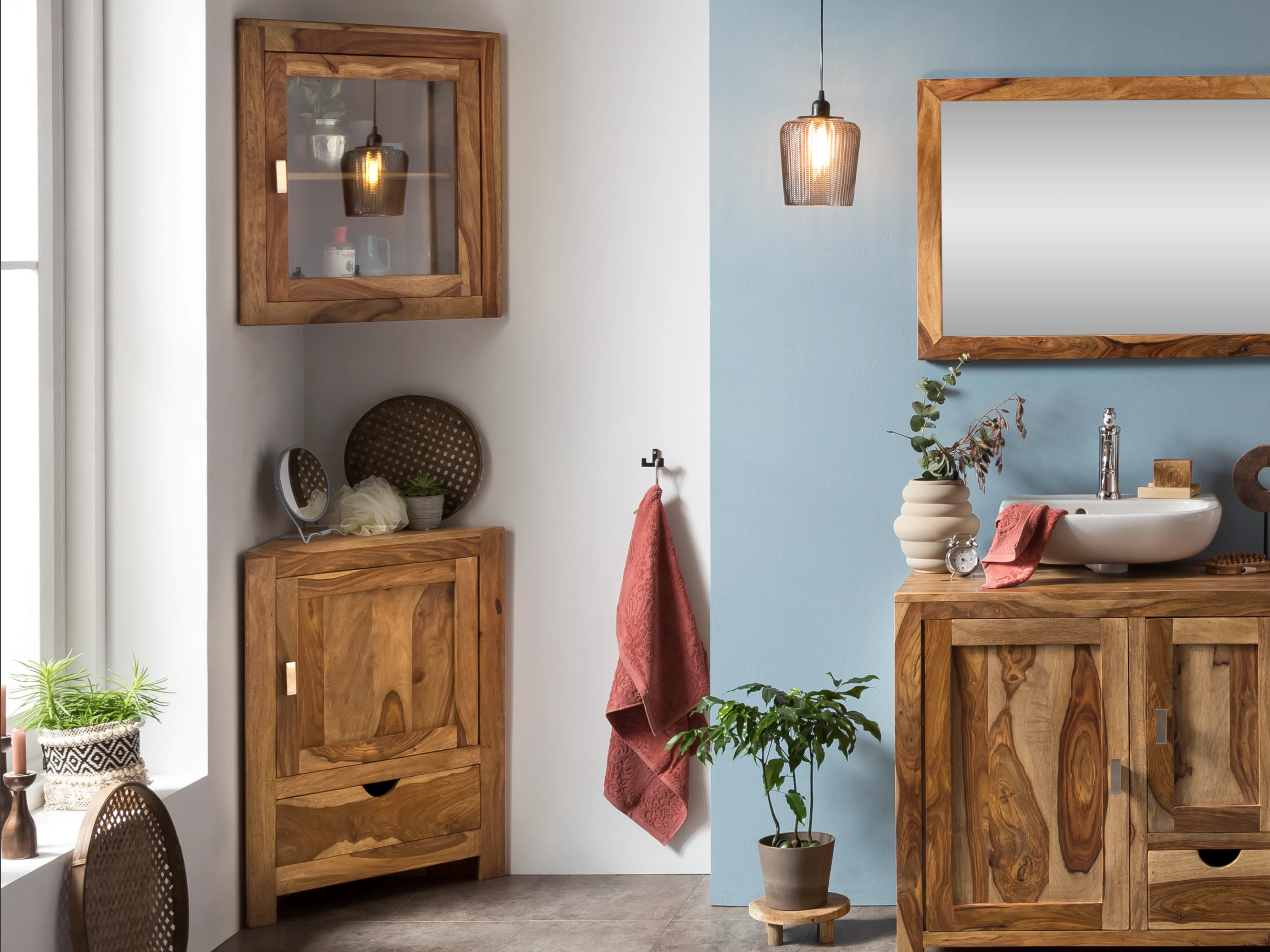 Die perfekte Lösung fürs Bad – nutzt die Ecke optimal und verbindet Waschplatz mit Stauraum, besonders sinnvoll in kleinen oder schmalen Bädern.