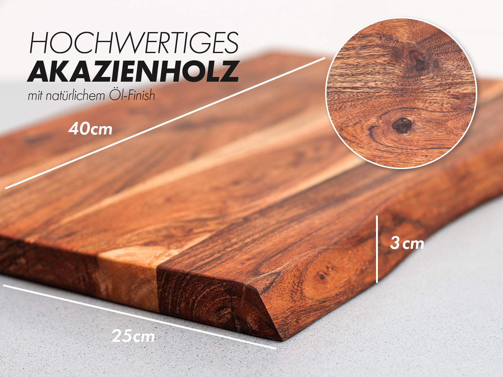 Das Schneidebrett ist aus hochwertigem Akazienholz gefertigt, ein echtes Holzbrett mit lebendiger Baumkante. Die handgefertigte Live-Edge macht das Küchenbrett optisch zu einem rustiakl wirkenden Dekobrett, das zugleich als Holztablett oder Servierbrett taugt. Akazie sorgt für warme Farbe und langlebigkeit, perfekt als Frühstücksbrett, Käsebrett oder kleines Schneidebrettchen.