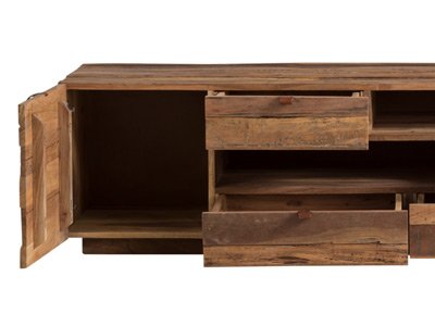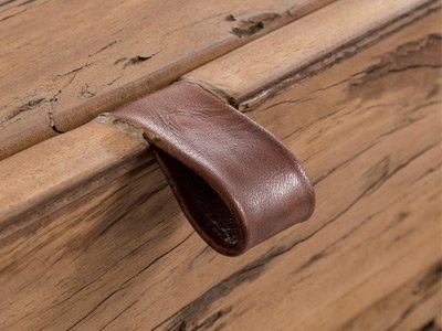 Dieser TV-Schrank begeistert sowohl hinsichtlich der Optik als auch in Bezug auf die Funktionalität. Seinen rustikalen Charme verdankt er in erster Linie der unverwechselbaren Oberfläche des massiven Altholzes, dessen ausgeprägte authentische Struktur den Blick auf sich zieht. Auch Nagellöcher, Risse und Verfärbungen prägen die unverwechselbare Optik. Gerade dies macht den einzigartigen Charakter der Bretter aus. Ergänzt wird das urige Design durch die braunen Ziegenleder ‚Schlaufen‘ als Griffe.