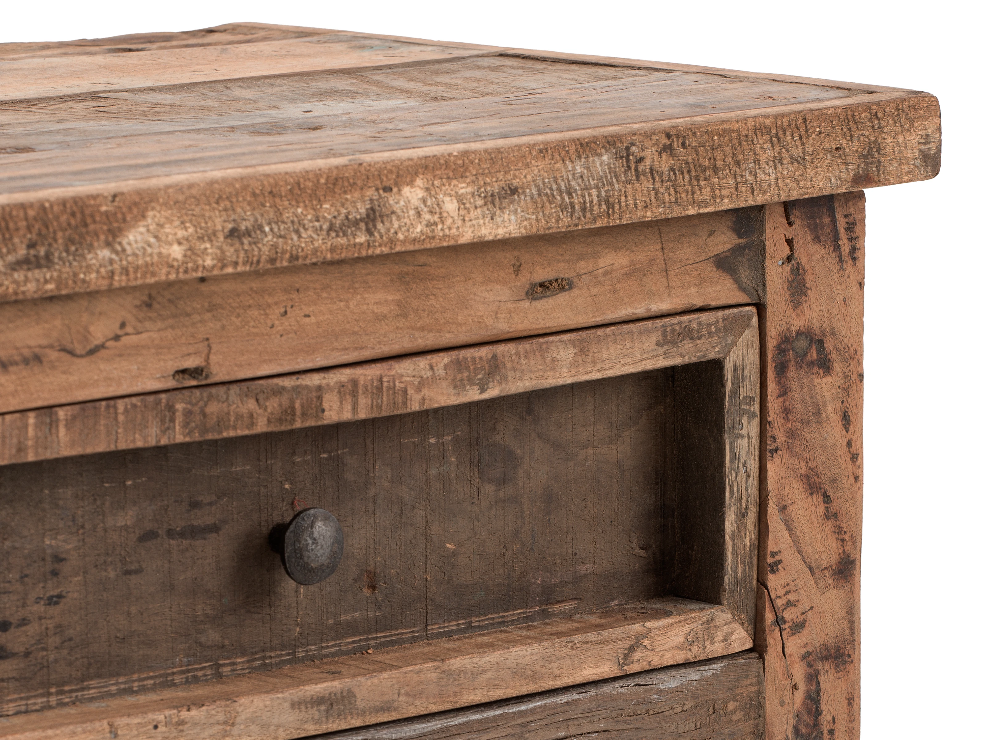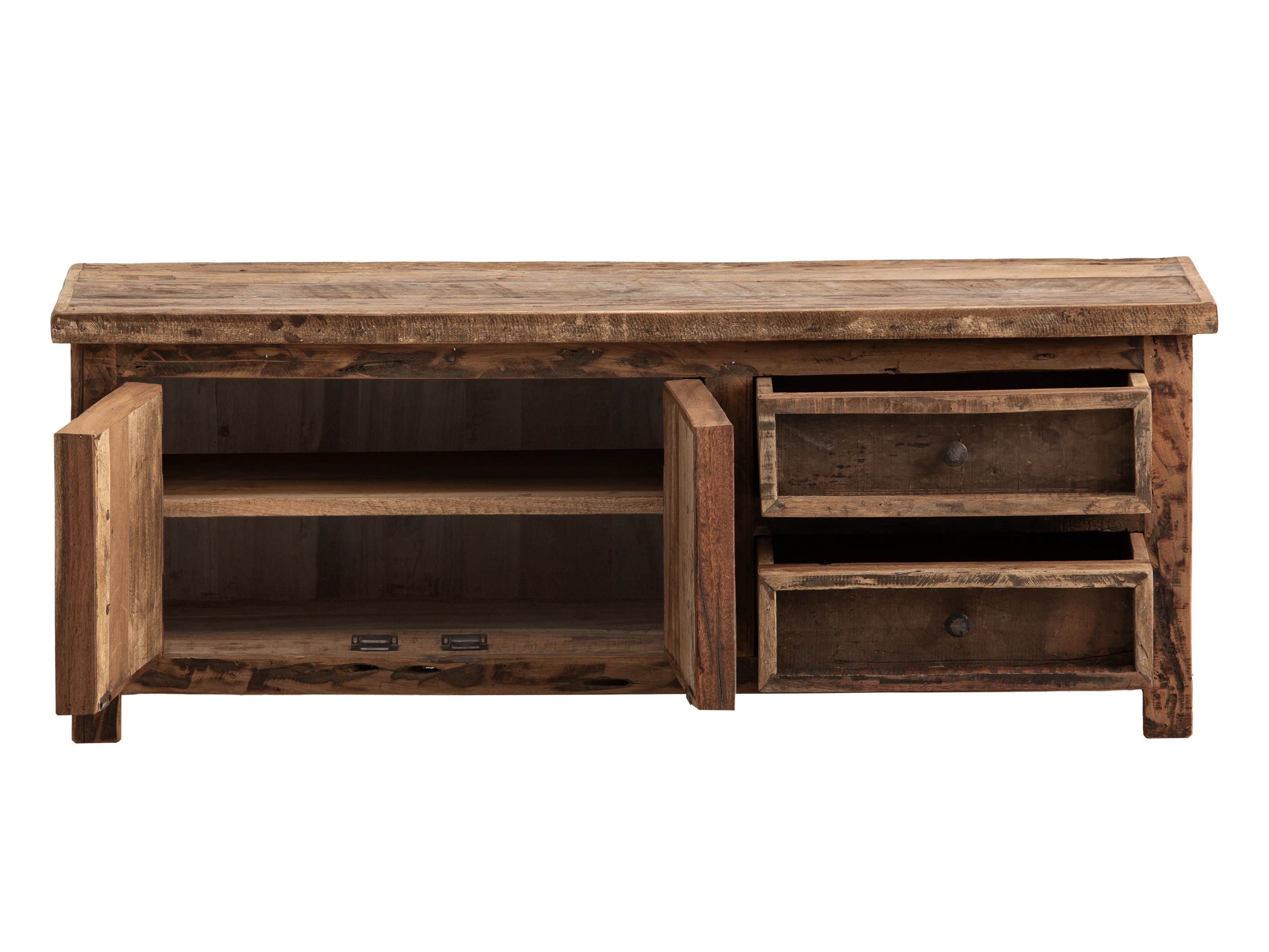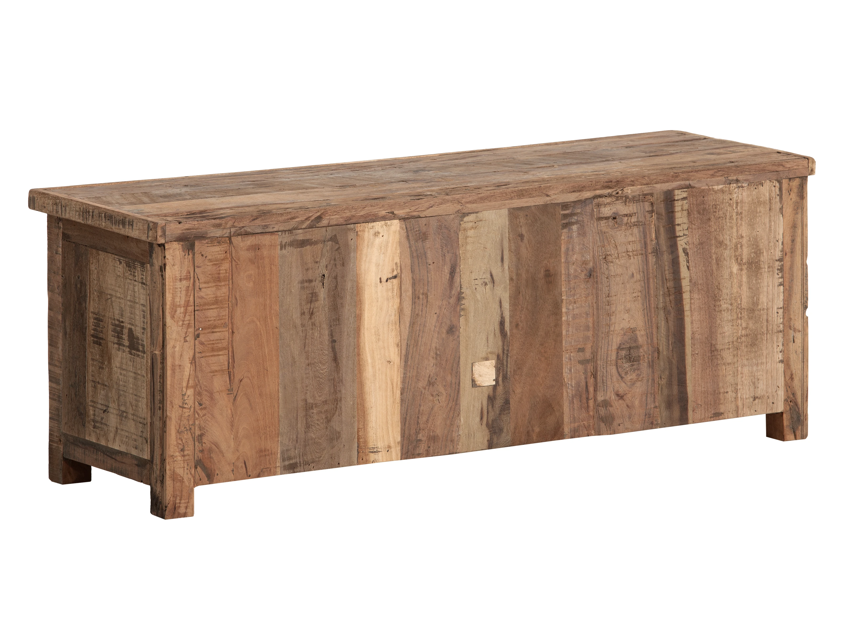 Die TV-Bank Sumatra ist aus recyceltem Altholz gefertigt und jedes Stück ein Unikat. Das unbehandelte Holz zeigt natürliche Maserungen und kleine Gebrauchsspuren, die der TV-Bank Sumatra ihre rustikale Optik und viel Charakter verleihen.