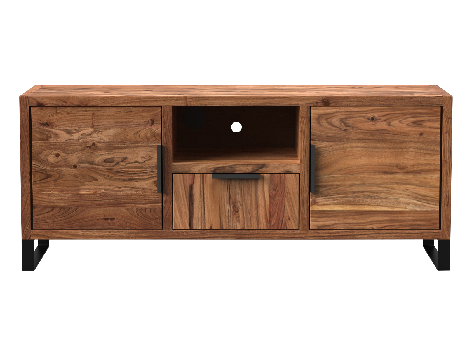 Die schwarzen Metallfüße und Griffe geben dem Möbel den coolen Look und stabilen Stand. Die Metallfüße haben eine Fußhöhe von ca. 10 cm und müssen noch montiert werden. Als TV-Schrank-Akazie und Medienmöbel-massivholz ist das Board robust und langlebig.