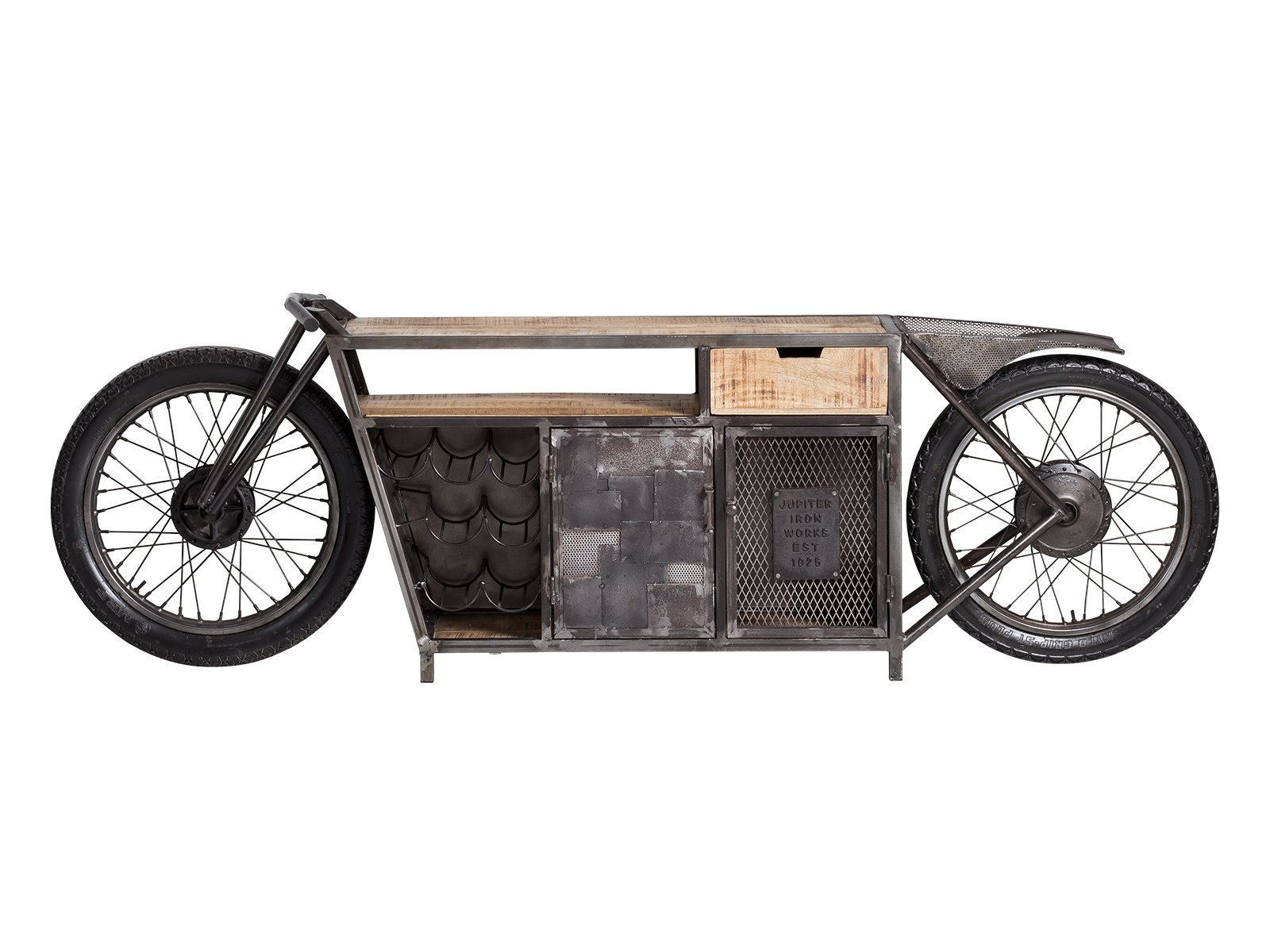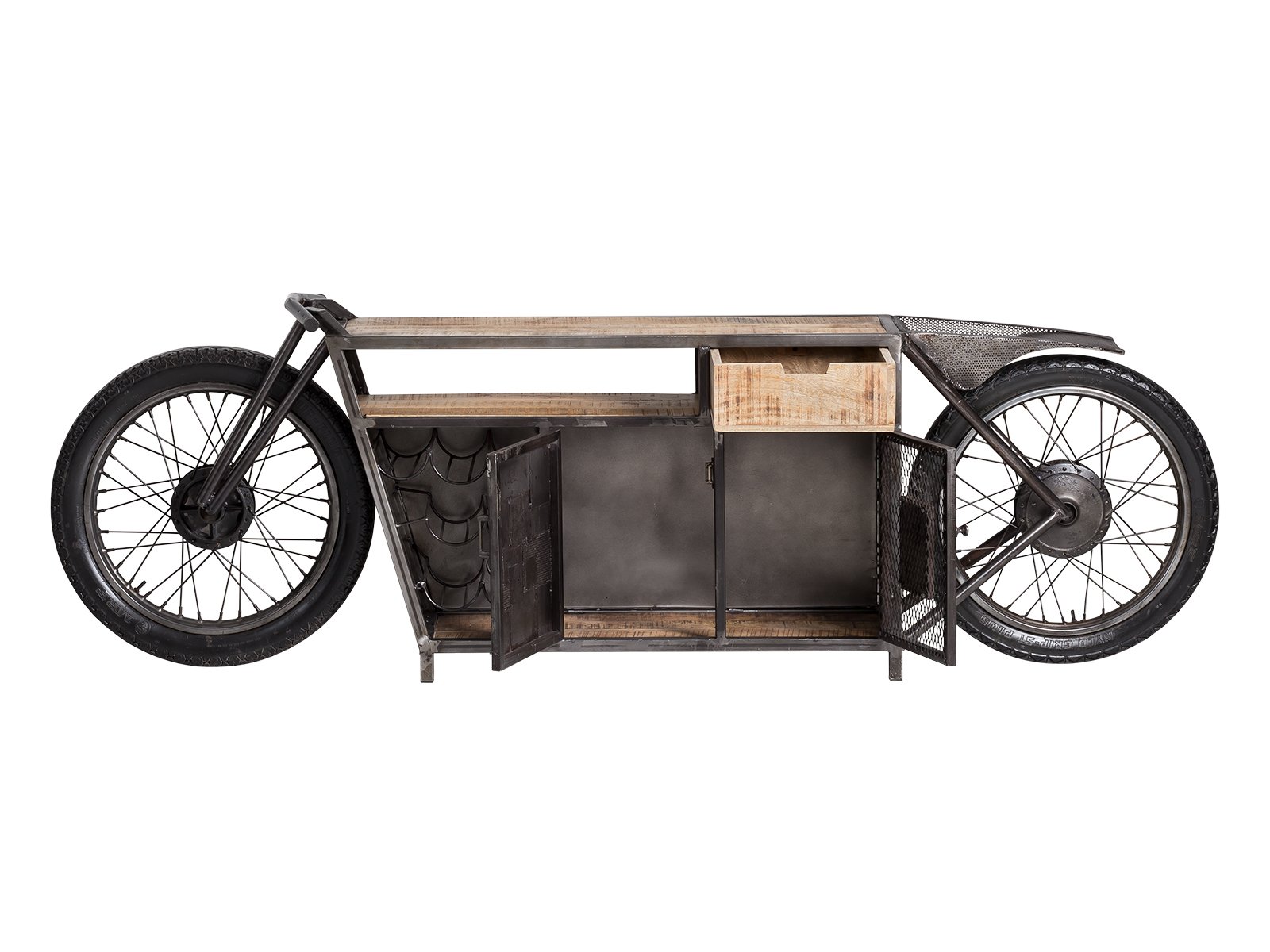 Die Motorrad Konsole Harlow bietet viel Platz: ein Schubkasten, ein offenes Fach (60x15 cm) und zwei Türen mit Fachtiefe 33 cm. Zusätzlich gibt es ein Flaschenregal und eine große Ablage, ideal wenn du die TV-Bank oder Hausbar nutzen willst. Perfekt, um Kabel, Gläser und Medien ordentlich zu verstauen.