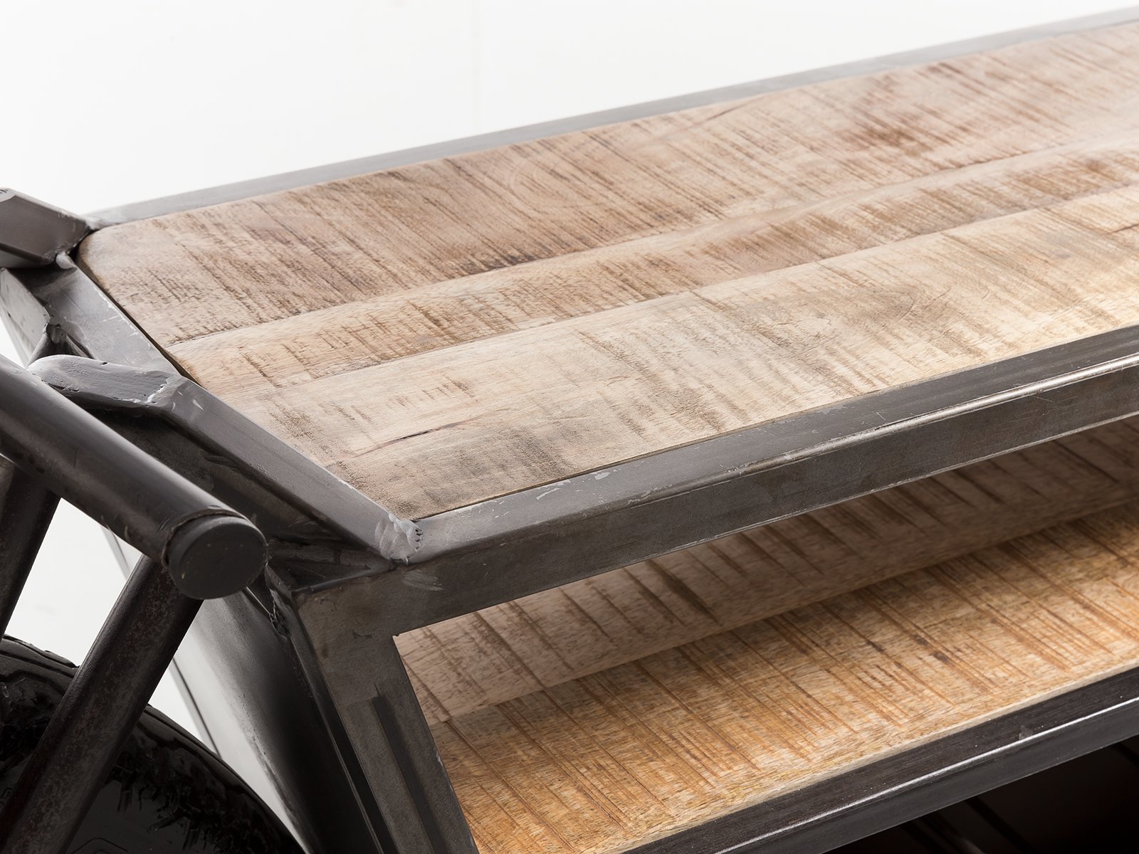 Der Konsolentisch Harlow Bike ist ein echter Blickfang mit seinem Motorbike-Design, Mangoholz-Ablage und robustem Metallgestell. Als TV-Konsole Motorbike Harlow verbindet er rustikales Mangoholz mit industriellem Metall, wirkt wie ein kleines Kunstwerk und bringt Upcycling-Charme in dein Wohnzimmer.