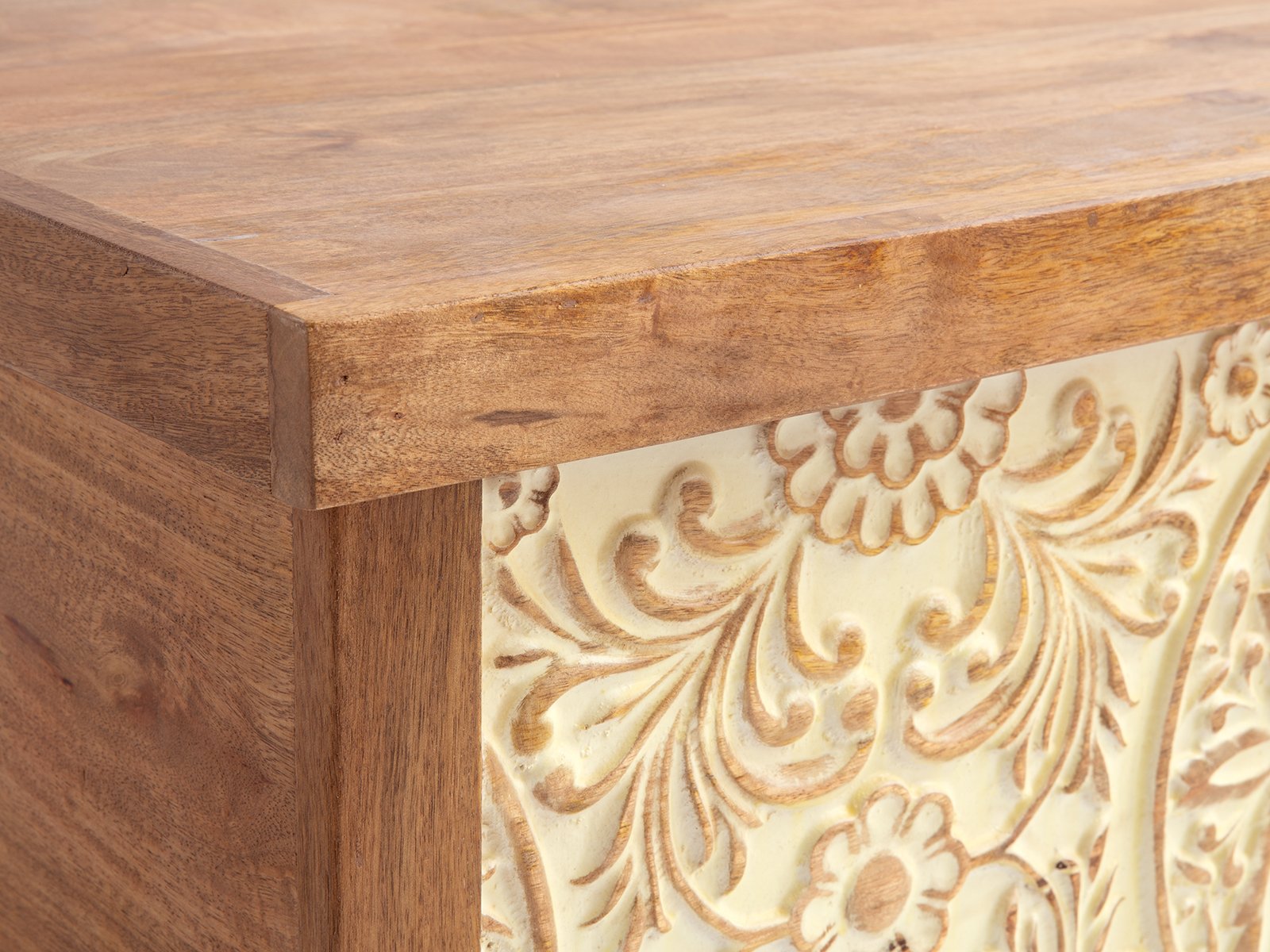 Die Truhe Delhi ist aus solidem Mangoholz gefertigt und zum Schutz lackiert, sodass sie robust bleibt und lange Freude macht. Du spürst die warme Maserung des Mangoholzes und die liebevollen Schnitzereien im Landhausstil, die dem Möbelstück seinen rustikalen Charme geben.