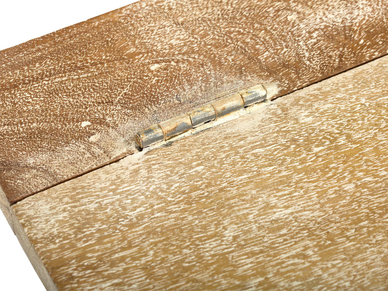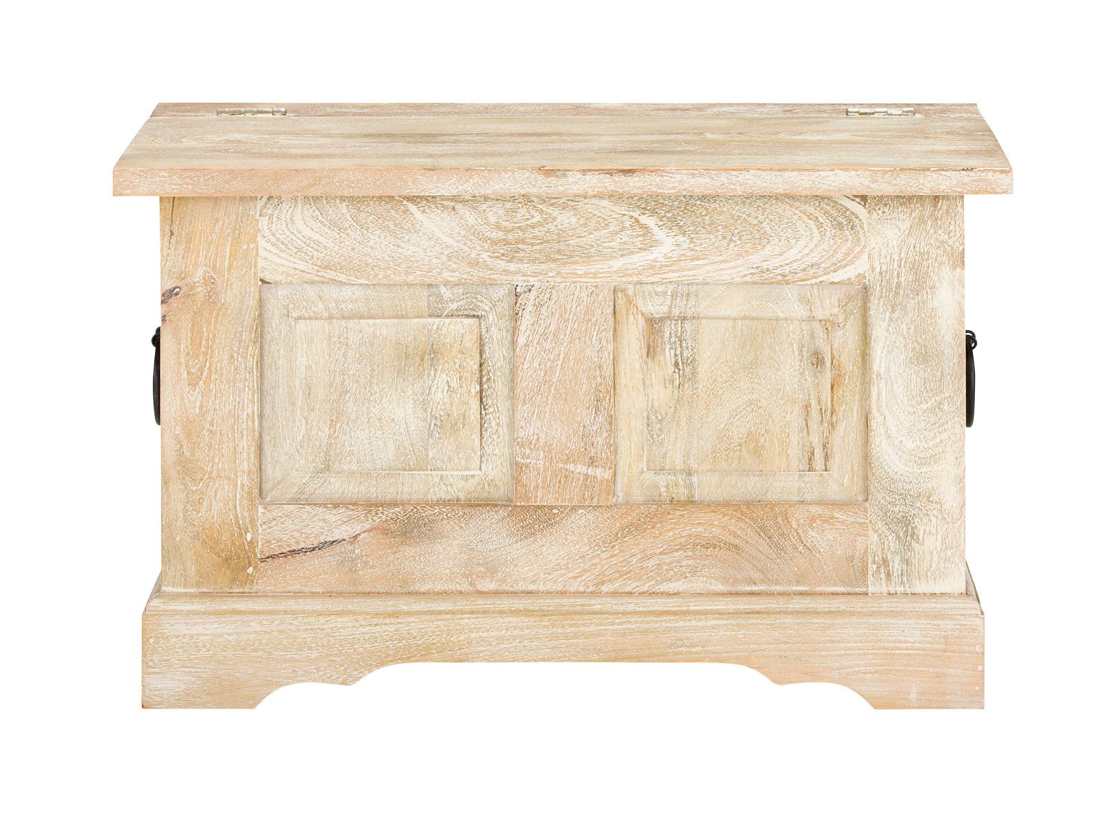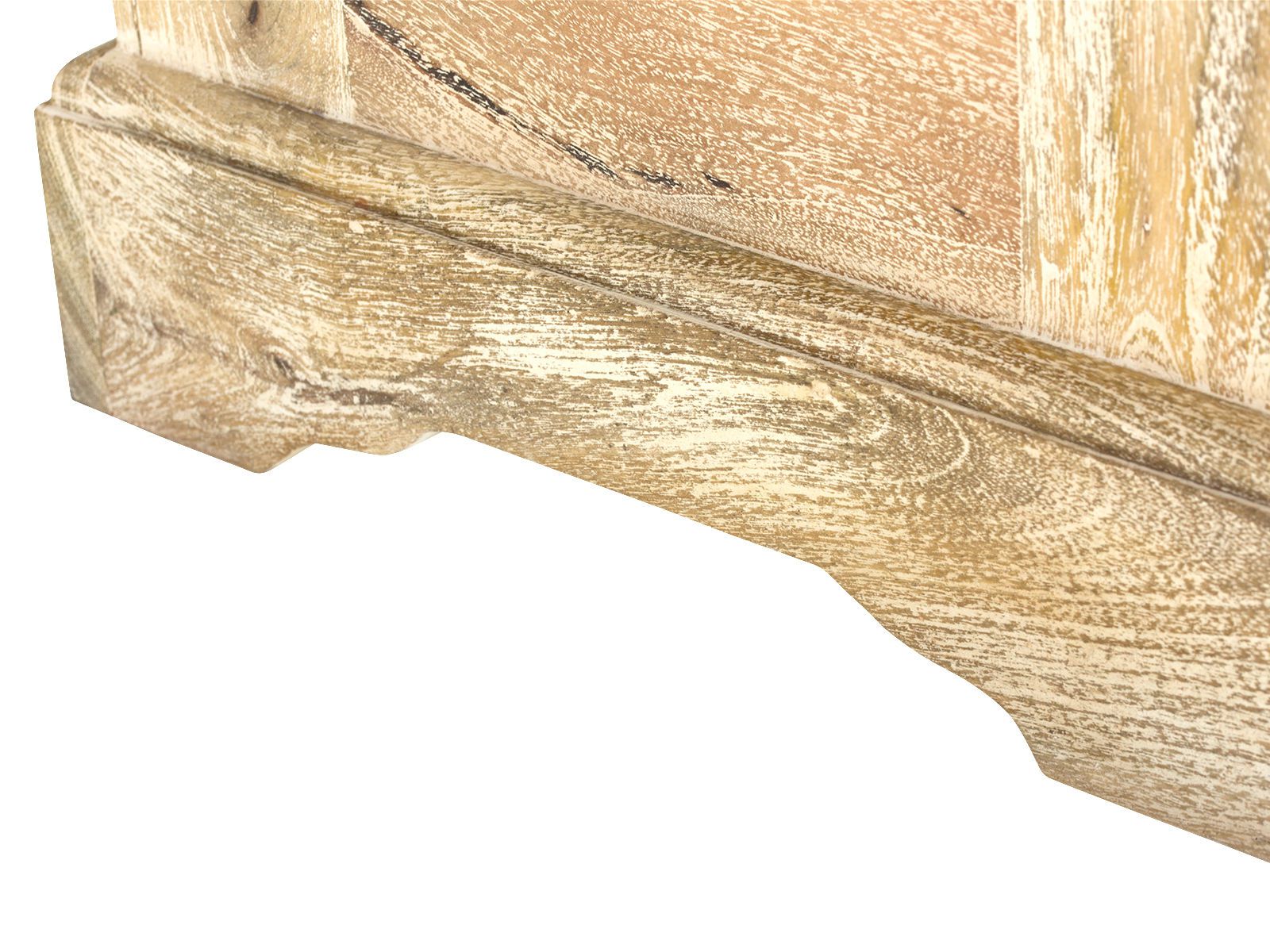 Die Holztruhe wurde aus massivem Mangoholz gefertigt und bringt damit nicht nur Stabilität, sondern auch eine wunderschöne Maserung mit, die bei jedem Stück einzigartig ist. Die helle Patina verleiht der Truhenbank einen mediterranen Look – als käme sie direkt aus einem kleinen Haus am Meer.