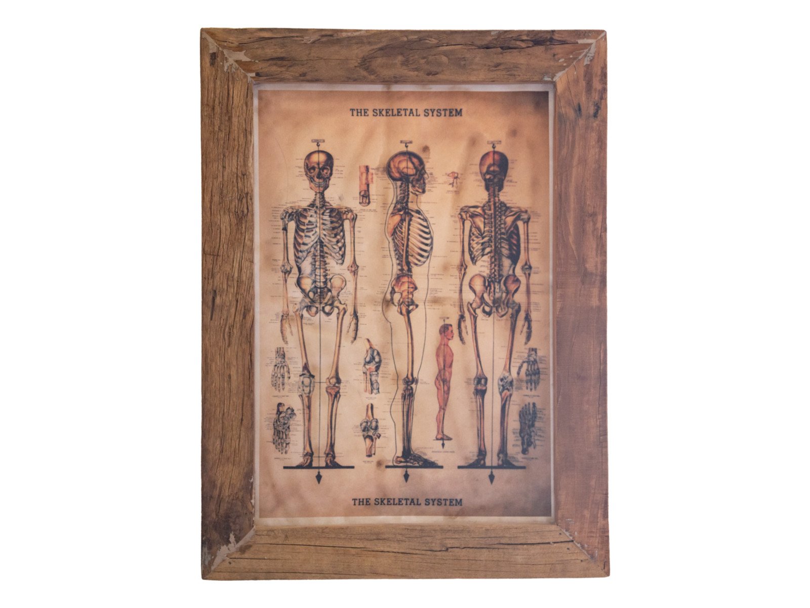 Das Wandbild Skeleton besteht aus recyceltem Hartholz und Altholz, liebevoll zusammengesetzt zu einem rustikalen Holzrahmen mit Canvas-Druck. Du hältst ein echtes Einzelstück in den Händen, kein Massenprodukt, perfekt als Wanddekoration oder Wanddeko für dein Zuhause.