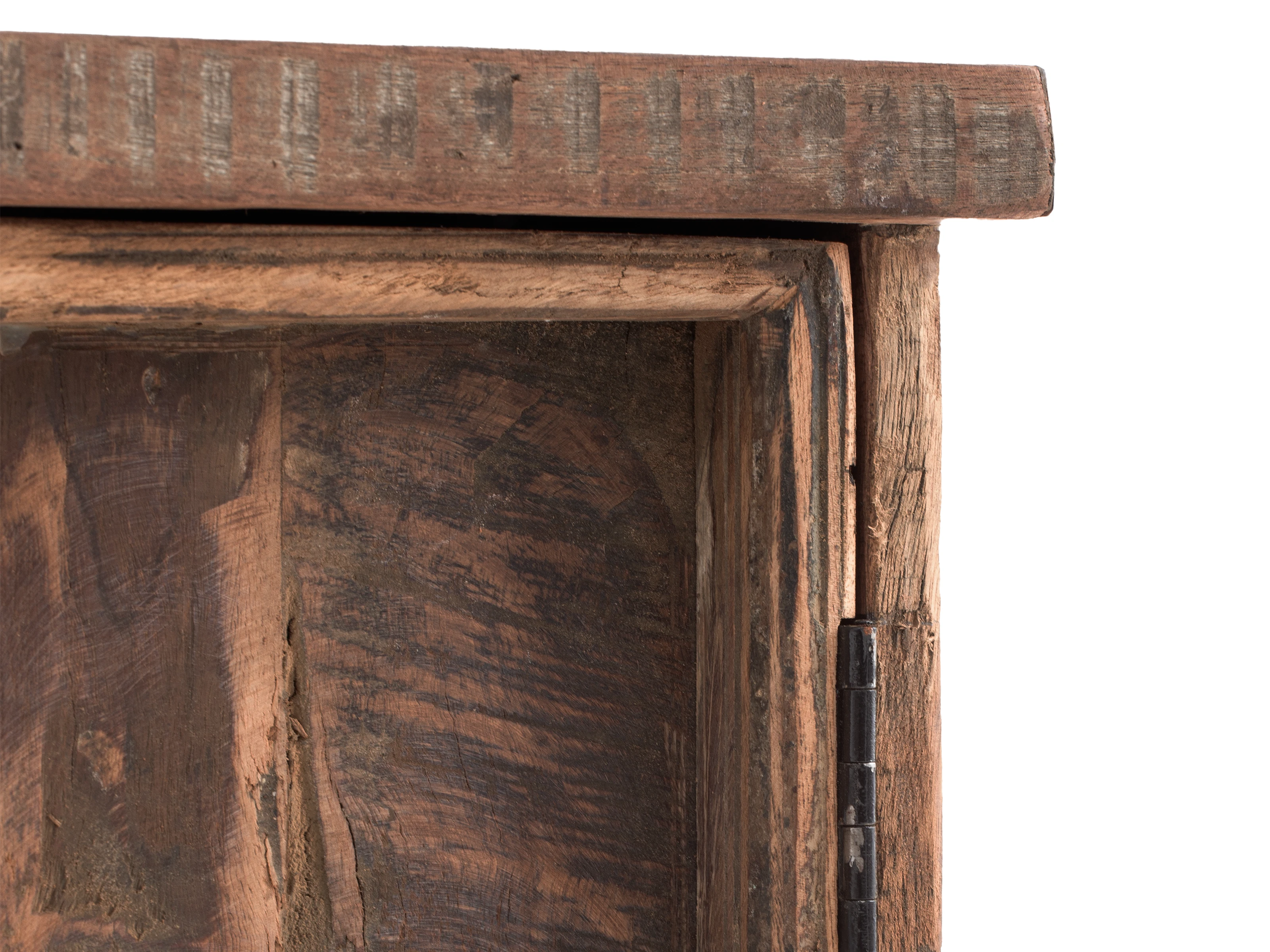 Der Schrank besteht aus recyceltem Altholz, jedes Stück ist ein Unikat. Die unbehandelte Oberfläche zeigt Risse, Scharten und Kerben, das macht den rustikalen Charme aus und unterstreicht den nachhaltigen Charakter von Altholz und recyceltem Holz.