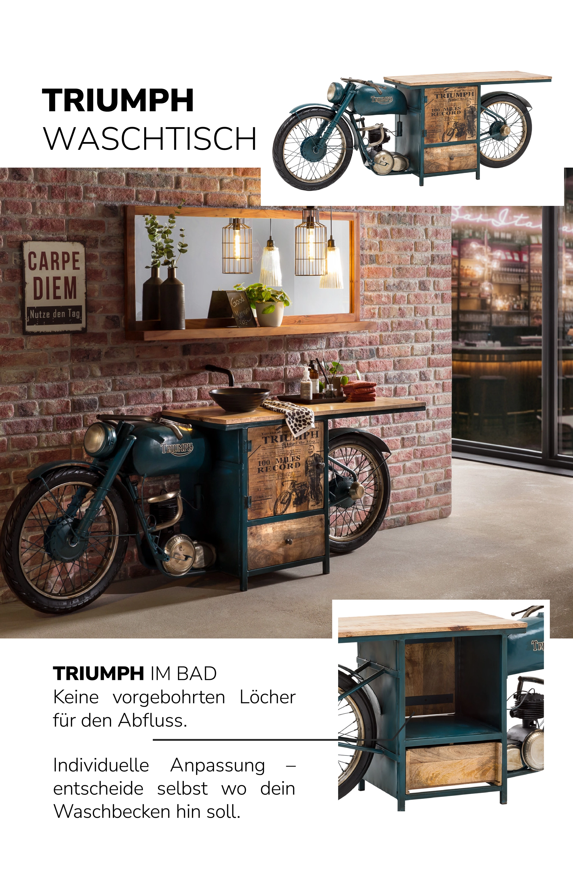 Wir entwerfen abgefahren Unikate – im Vintage Look, mit kreativer Optik und in echter Handarbeit. Waschtische, die aus alten Bikes gebaut wurden und eine stylische Ablage aus Mangoholz haben. Maßarbeit können wir nicht bieten, dafür aber wirkliche Einzigartigkeit