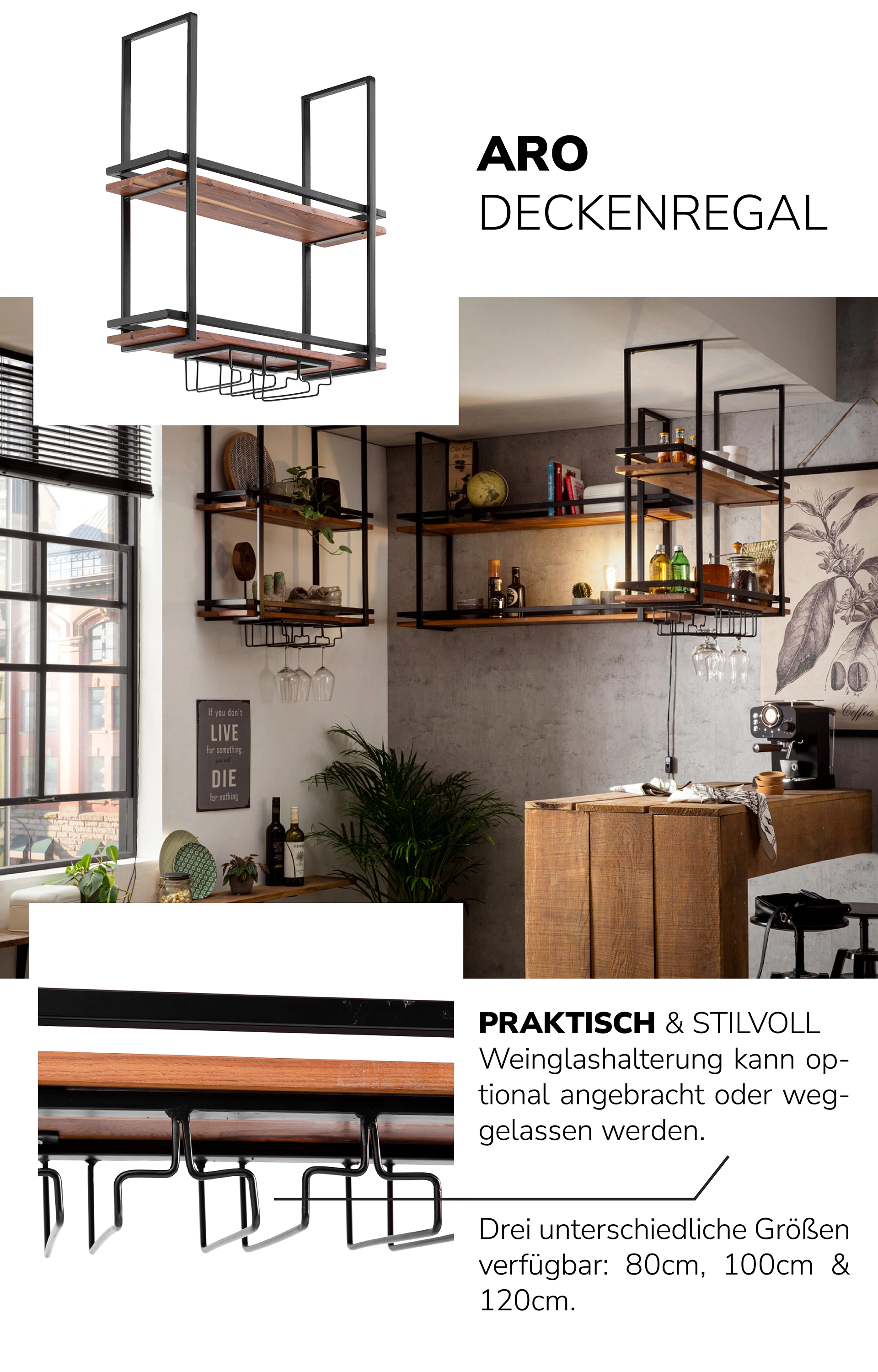 Du kannst in unseren Regalen Flaschen, Gläser als auch Küchenutensilien unterbringen. Und du kannst entscheiden, ob dein neues Flaschenregal im Industriedesign, Retro-Look oder klassischen Stil daherkommen soll.
