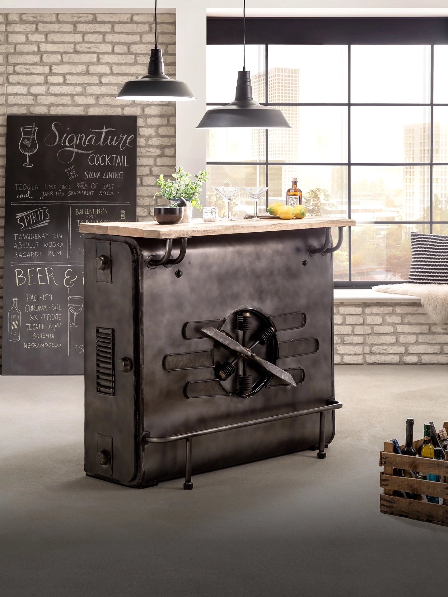 Gläser, Flaschen, Lebensmittel und alles, was sonst so von echten Bartendern genutzt wird, findet Platz. Die recycelten Materialien erzählen einen Schwank aus der Vergangenheit und halten zusammen mit dem Massivholz und dem Stahlblech, was sie versprechen.